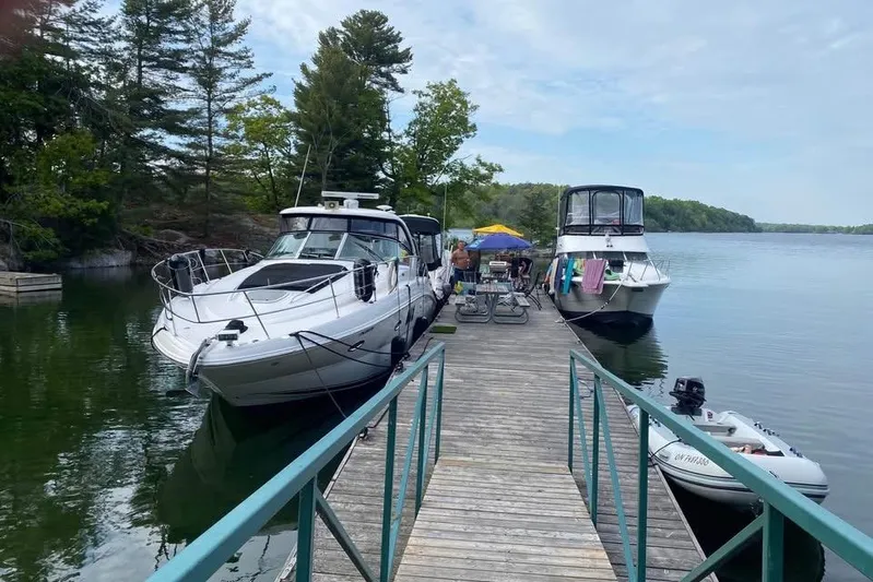 The cockpit is further enhanced with Fusion speakers that feature built-in lighting, along with multicolour underwater lighting. A dinghy davit system is also in place, adding versatility for tender handling. Additional conveniences include a transom shower and anchor washdown. Overhead, the factory hardtop with integrated lighting and an aft sunshade provides welcome protection from the elements while maintaining an open, airy feel.