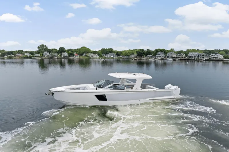 Powered by Twin 600HP JPO (Joystick Piloting) Outboards – White, this model offers smooth, responsive handling with exceptional performance and easy docking.