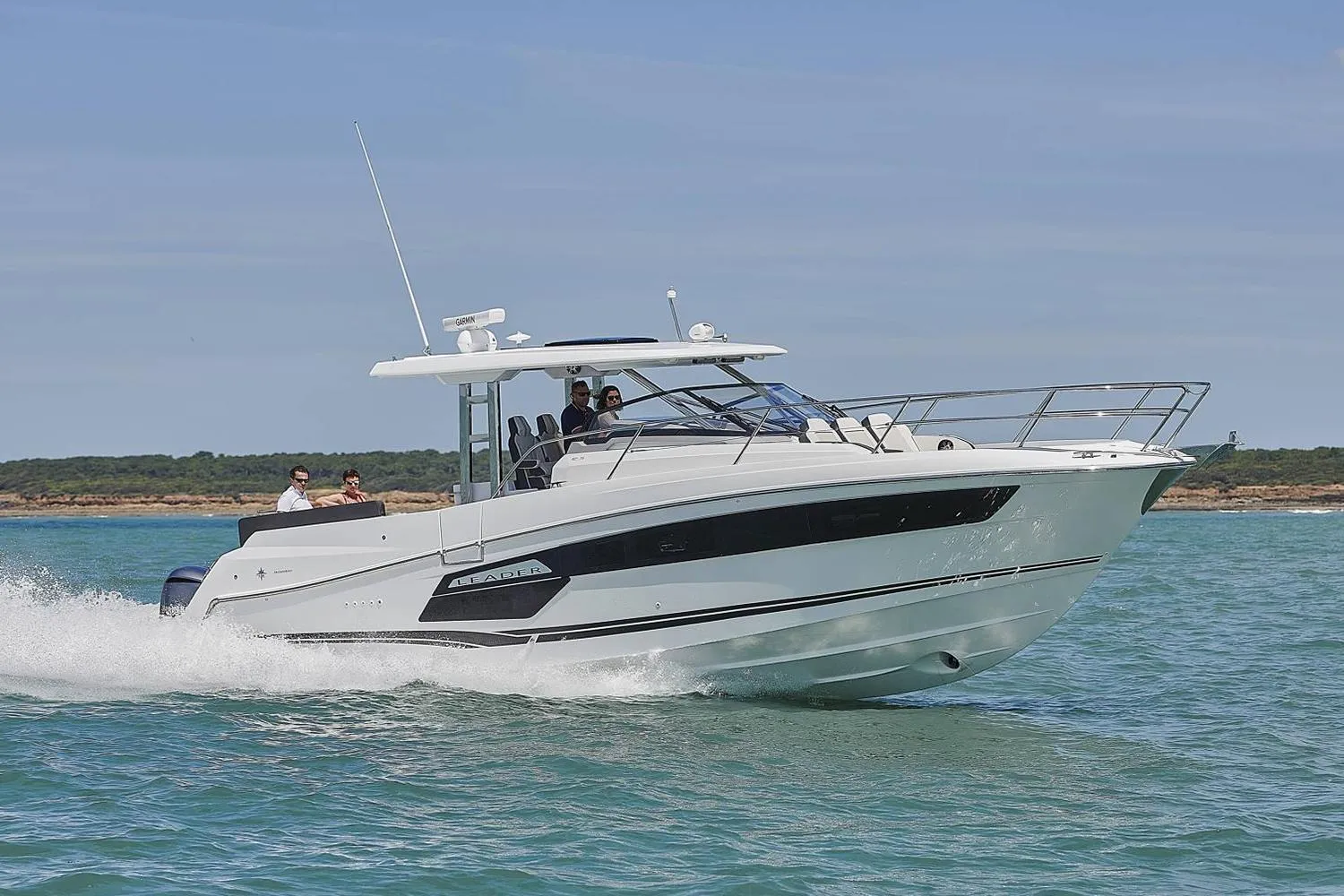 Triple 4.2-liter, 300-horsepower Yamaha V6 four-stroke outboards, chosen for their compactness, lightweight and powerful output, are the standard, optimal engine package on the Leader 12.5 WA, offering a range of cruising speeds from 30 mph to 35 mph, and can reach a top-end speed of 50 mph when conditions allow — without the need for hull steps.