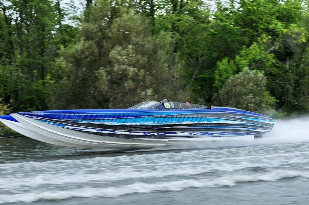 No expense was spared on the boat build including a totally over-the top stereo system with pop-up speakers near the transom. The 4000 Roadster has a full sunpad, wraparound windshield, six-person cockpit, cabin, enclosed head, swim platform over the drives and more. This vessel features a $60,000 Visual Imagination carbon fiber paint job, front and rear cameras with seat back tv's, two Garmin GPS, dual helm, Sea-Dek in cockpit, battery charger and much more. On its Myco aluminum trailer, the entire package is yours for only $549,999 USD.