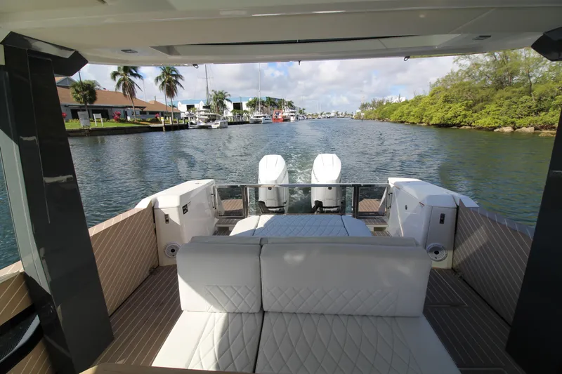 Inside, the enclosed wheelhouse offers panoramic visibility, premium helm technology, and comfortable seating, while the lower deck provides overnight accommodations rarely found in a performance-oriented yacht of this size.