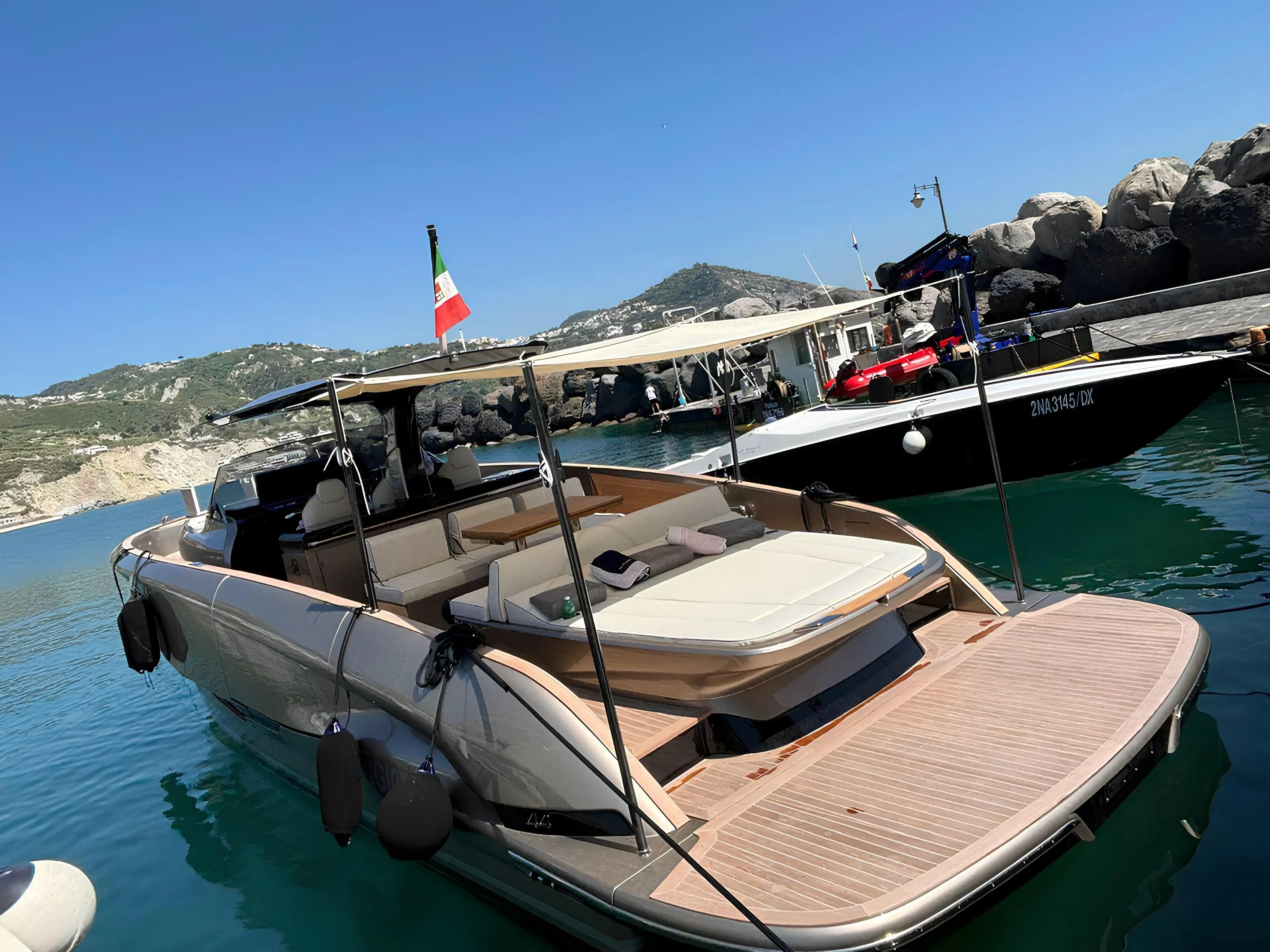 From her striking profile to her exceptional seakeeping, the 44 Open delivers an unmatched experience whether you’re cruising at 30+ knots or anchoring in quiet bays. Built for all-weather, all-season enjoyment, she boasts a deep-V hull designed by Brunello Acampora, ensuring remarkable efficiency, stability, and smooth performance—even in rough seas.