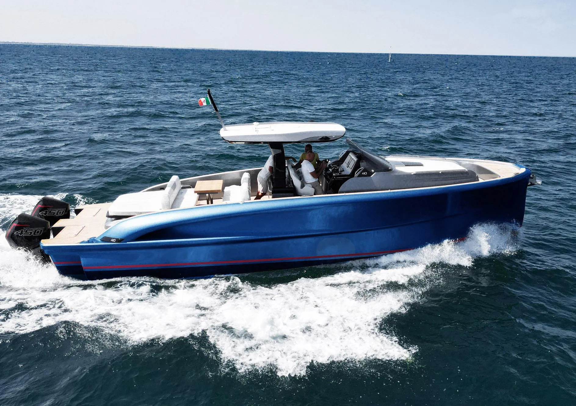 This Solaris Power 40F comes with upgraded twin Mercury 450R outboards. Its metallic blue hull and silver top side combination makes a unique and elegant statement. She is fast, elegant and extremely well built.