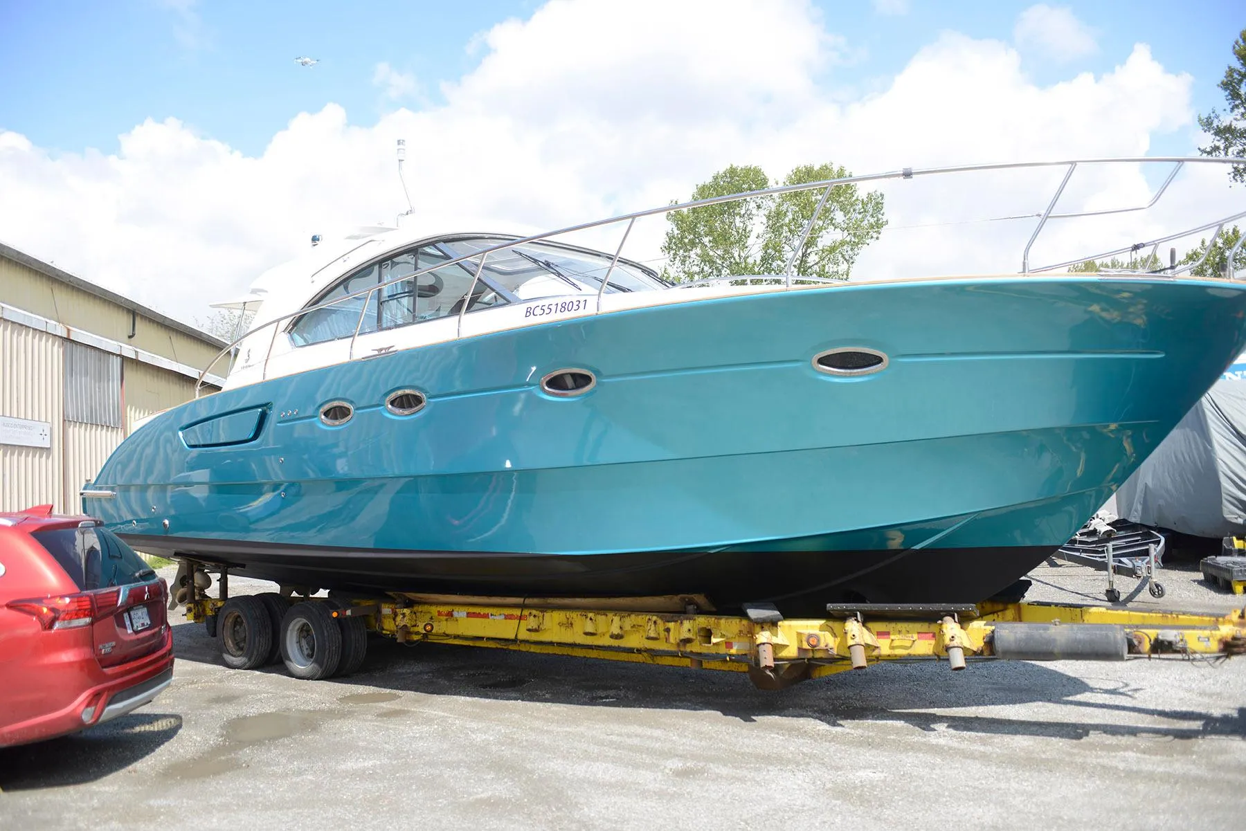 This sport cruiser doesn't just have stunning looks but also has agility, speed and great fuel economy with the Volvo diesels on IPS pod drives. Cruise at 1500 rpm at 9.5 knots 4.4 gph with a range of 600 nautical miles, 2500 RPM gets 20 knots at 14 gph with a range of 380 nautical miles. Wide open throttle tops out around 35 knots. There is a full width swim grid, and the cockpit door opens onto a generous teak decked cockpit with a cockpit brow, cockpit fridge and table. The outer deck walkaround is wide and easy to navigate to the bow area. The stainless steel encased Alaska bulkhead opens up to the generous open plan bright salon area. The U shaped dinette seats up to six. The inline galley to starboard has a two burner cooktop and stainless sink. The helm has great visibility and seats 2. The master stateroom has a large queen island berth 6'7' length and features an ensuite with a walk in shower. The second stateroom also has an ensuite. The diesel Volvo D6 motors have only 825 hours, the 4 kw Onan genset has 348 hours. Other features include: new IPS drives with new props, the motors were removed and replaced starter motors, alternators, belts, pulleys, water pumps, end engine beds, install swim ladder, bow and stern thrusters with remote, glendinning 505 amp shore power system, all new batteries including , house , thruster and start, new battery cables, new inverter charger, 2 diesel furnaces serviced, LED lights, New Ray marine electronics package, new V berth mattress, new 400 ft chain and anchor, install GFI shore power breaker, new vacu heads, replaced all thru hulls, remove old paint to hull and repaint with Imron repairable urethane, install 5 interior fans, remove and replace Lexan retractable sliding roof, re & re VHF radio, custom cockpit brow. This boat had a grounding 5 years ago and has been gone over stem to stern and has 4 years of proven reliable cruising since. Off site, call for appointment to view.
