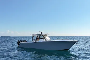 Fishing capability is exceptional, highlighted by four massive insulated fish boxes, triple livewells, electric reel outlets, Gemlux outriggers with carbon poles, extensive rod storage, and a wide, open cockpit with dive door access. The JL Audio premium sound system, underwater lighting, and transom seating make this boat equally suited for entertaining.