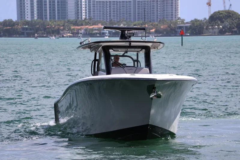 The helm is equipped with a full Garmin electronics package including twin 22” Garmin displays, an additional 12” Garmin, and a 9” Mercury VesselView display. Navigation is enhanced with radar, autopilot, and NightTrack night vision, making this boat ready for running day or night.