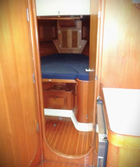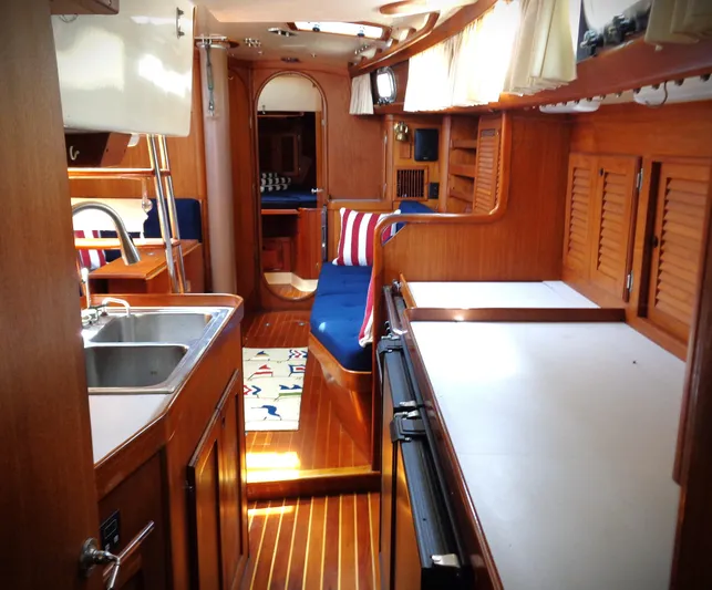 - Step-down to galley and passage to aft stateroom, aft to starboard