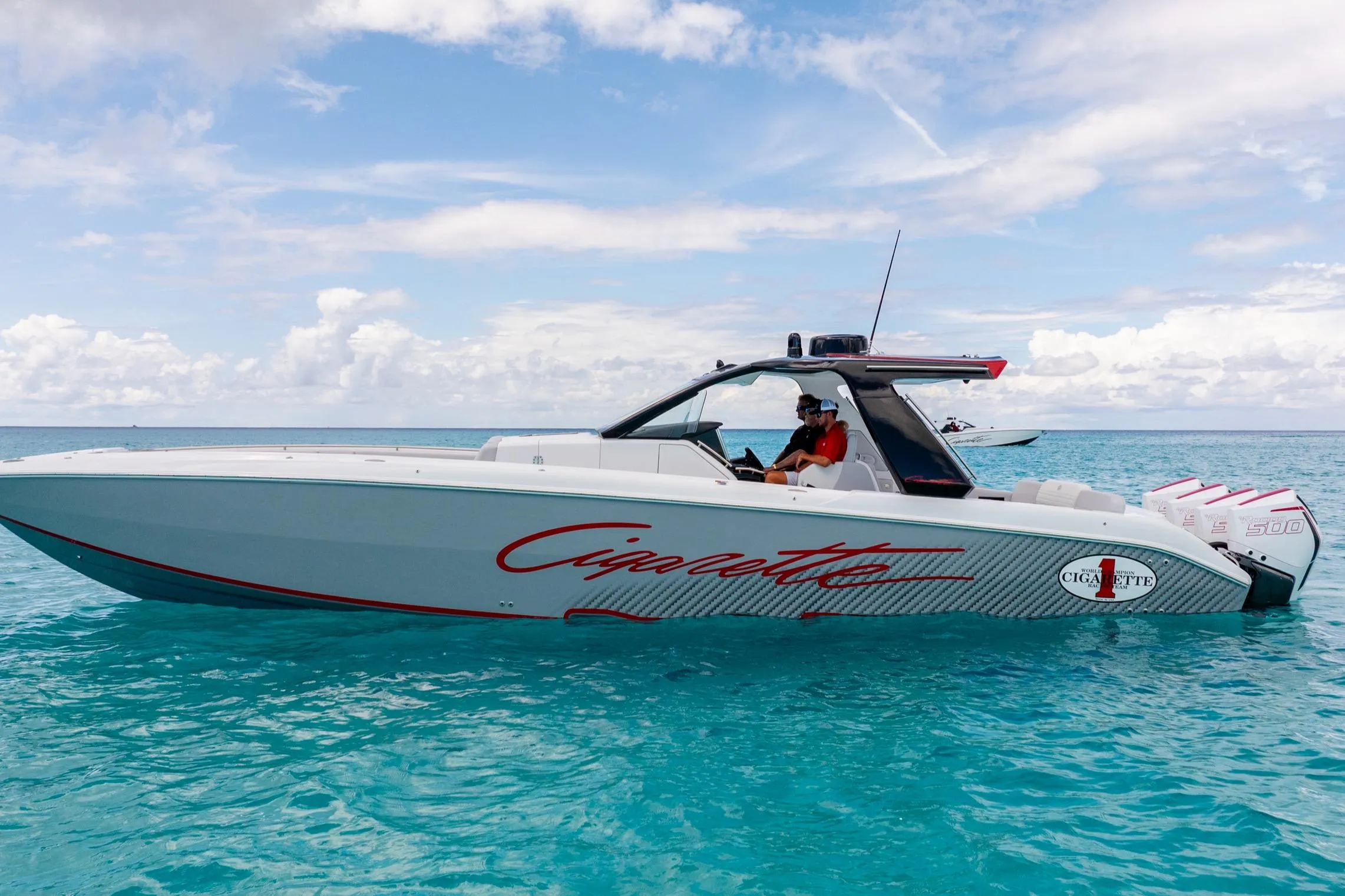 The 2025 Cigarette 41 Nighthawk is the perfect fusion of offshore performance and refined luxury, powered by quad Mercury Racing 500Rs for uncompromising speed and control. Finished with a Medium Grey hull bottom, complex paint with custom graphics, engine cowl accents, and a white gel coat deck, this Nighthawk makes a bold statement at every dock and destination.