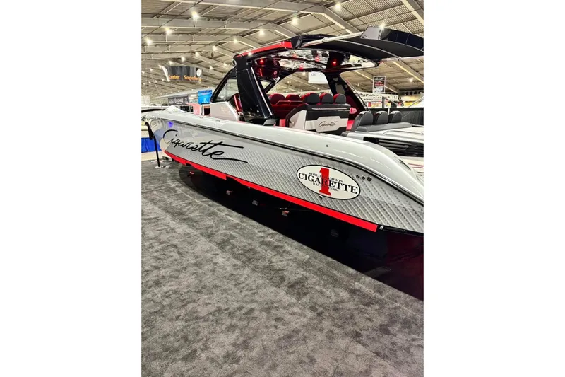The 2024 Cigarette 41 Nighthawk SD blends aggressive styling with offshore ready performance, finished in Black gel coat with the striking Nighthawk Sport Paint Package. Designed for both speed and comfort, this boat features dual-row seating, power-adjustable helm seats, soft deck and non-skid flooring, telescoping aft sunshade, extended swim platform, and an integrated windlass and bow thruster for effortless handling.