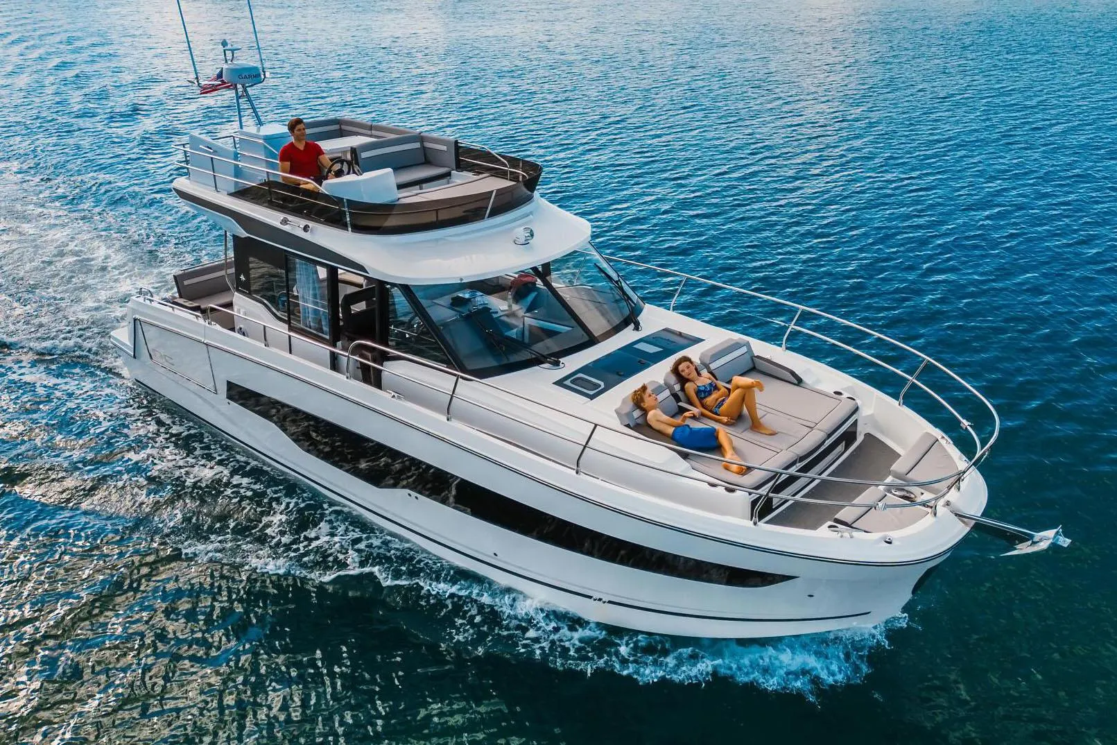 This model features multiple living spaces especially designed for relaxation with family and friends. Plenty of time for swimming and moments with your feet dangling in the water from the aft cockpit, with the electrically controlled starboard-side terrace. Port side, a large side door facilitates access for everyone on board. Far from the everyday, you can lounge comfortably on one of three integrated sun loungers on the forward deck, for guaranteed moments of pure relaxation! Sun worshipers will enjoy the fully equipped flybridge for driving at full speed, sunbathing in complete privacy, and enjoying a cocktail with a view of the sea at the end of the day!