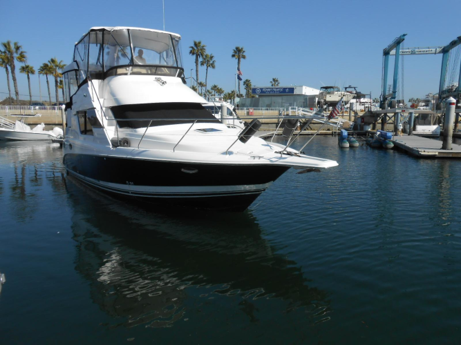 Built on a solid fiberglass modified-V hull, the two stateroom floorplan is arranged with a mid-level galley and dinette and double berths in both staterooms. This is a huge interior for a 35-footer, and the salon dimensions can easily be compared to those of a much larger boat. Both heads are fitted with separate stall showers, and the mid-level galley has plenty of counter space and storage. An aft-deck wet bar was standard along with a hardtop, and there’s seating for six on the flybridge. (Note that this is the same flybridge mold used for Silverton’s 351 Sedan.) Additional features include a curved staircase from the large swim platform to the aft deck and a spacious engine room.