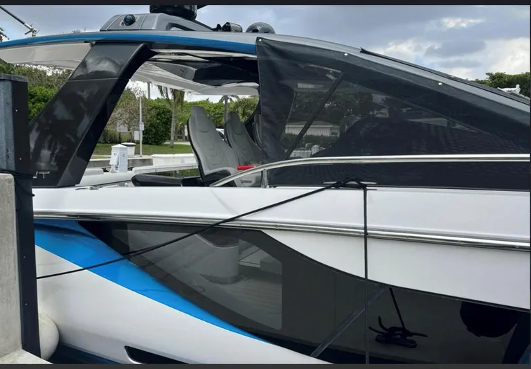 It comes equipped with features like a Seakeeper gyro stabilizer, a Skyhook system, and advanced navigation electronics. The boat also includes a bow sunbathing area, a galley with modern appliances, and a comfortable salon with plush seating.