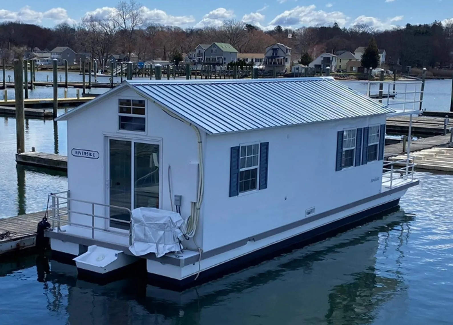 Exclusive One of Kind Opportunity in Beautiful East Greenwich Rhode Island! This beautiful floating home features a grandfathered-in slip at one of RI’s nicest marinas in the beautiful and desirable town of East Greenwich! The boat sale includes a fully paid Summer 2025 season slip!! (A $6000+ value) Additionally, all the furniture is included in the sale!! (See broker’s comments at end) Houseboat slips in RI are almost impossible to otherwise find and this one is all yours for the taking. The boat is in excellent condition and is only 7 years old which further adds to the value proposition here. She features the highly desirable upper deck plus loft arrangement. This layout gives you both a warm weather upper relaxation deck PLUS an inside loft which can be used for extra storage and extra sleeping area. The Aqualodge is perfect for either year-round living or just as a summer/fall second home. This one features several factory upgrades the best of which is the LG Mini Split climate control system which accords year-round inside comfort and saves a ton of money in electricity! The Aqualodges feature a virtually maintenance-free platform with long lasting aluminum roof and vinyl clad exteriors and long lasting fiberglass hulls that need only occasional cleaning. This highly upgraded version is a must see for anyone looking for immensely affordable waterfront living for many many thousands of dollars less than any land based counterpart! Take it from yours truly-a liveaboard veteran of over 40 years! Living ON the water instead of looking at it from a distant condo cannot be beat-and this platform is probably the easiest and most carefree liveaboard options out there! Call today to discuss this EXCELLENT opportunity!