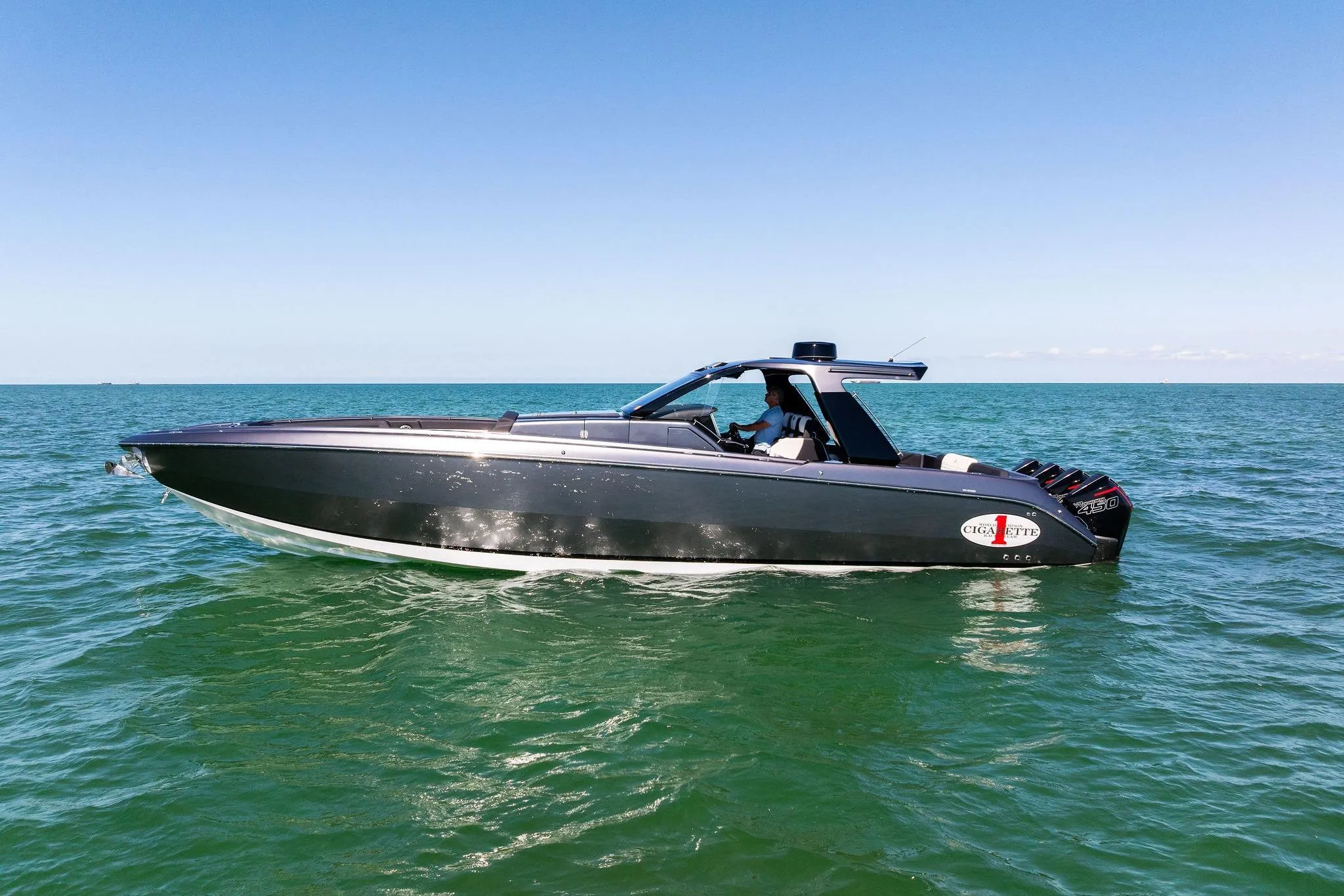 Experience Cigarette Racing’s signature blend of speed, luxury, and precision with this 2020 Cigarette 42’ Auroris. Powered by quad Mercury Racing 450Rs with just 365 hours (predominantly freshwater use), this vessel delivers thrilling performance and stunning craftsmanship. Always stored indoors, professionally transported, and freshly ceramic coated, great condition
