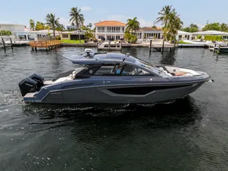 All additional info Fusion gray hull • Seakeeper 6 • 9 kW diesel generator with sound shield • Dual hydraulic beach doors • U-shaped cockpit lounge with retractable shade • Outdoor galley (fiberglass sink, fridge, electric grill) • Raised wet bar • Convertible bow seating/sunpad with teak table and optional foredeck shade • Private aft stateroom • Lower salon with U-shaped dinette/berth • Full galley and head • Ebony Oak interior • White South Beach upholstery • Full hardtop with side-opening windows and retractable shades • Underwater LED lights • Ice maker • Fresh-water cockpit washdown • Macerator with overboard discharge • Gray SeaDek flooring • LED spotlight • Exterior pillow package