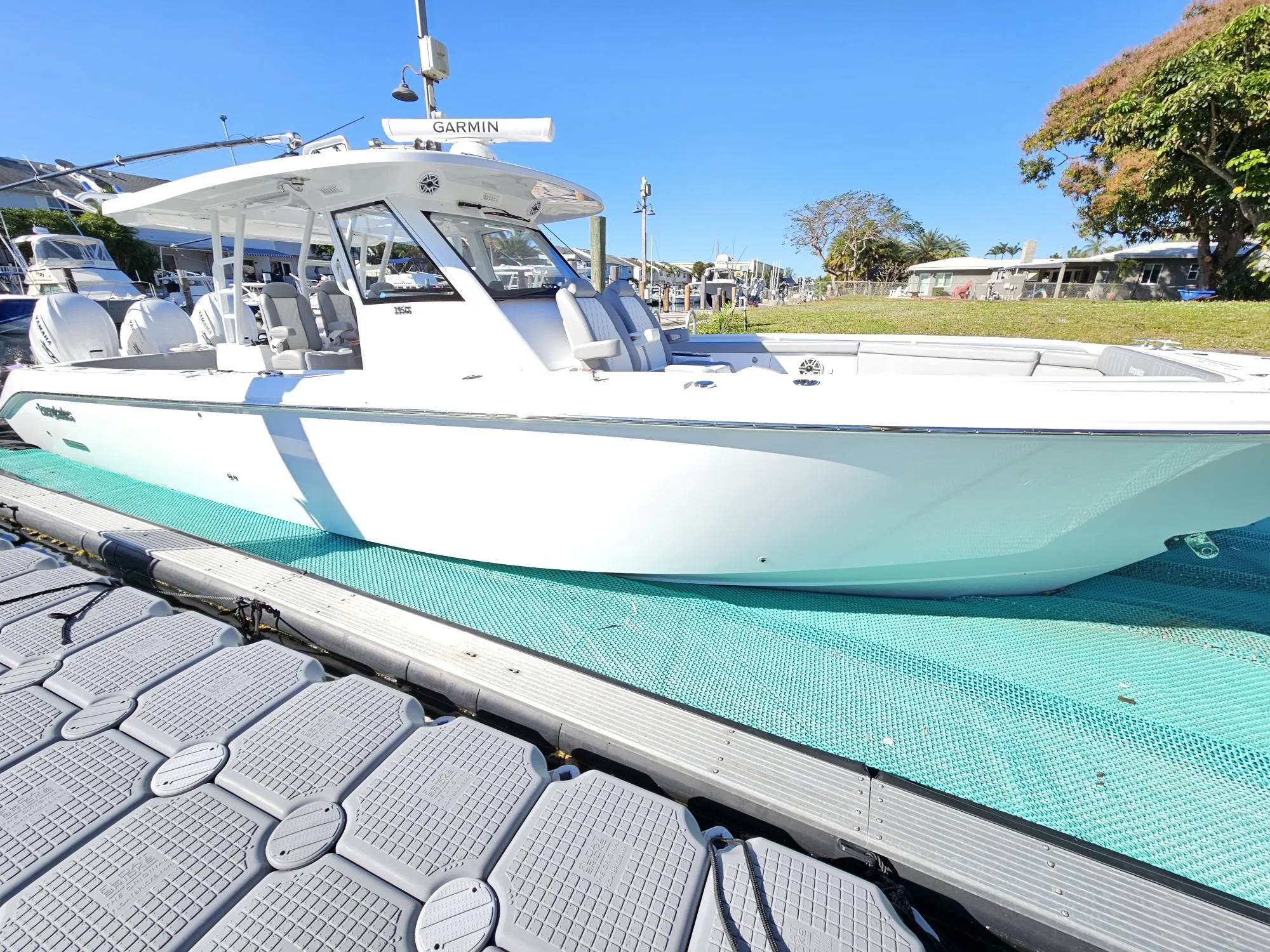 Under the hood, the Everglades 395 CC boasts a formidable trio of engines, delivering an impressive combined horsepower of 1350. Equipped with the Yamaha Helm Master EX Triple Engine XF450NSA2, this center console boat for sale offers unparalleled performance and reliability. The advanced engine setup ensures smooth acceleration, robust speed, and superior handling, making every trip both exhilarating and safe.