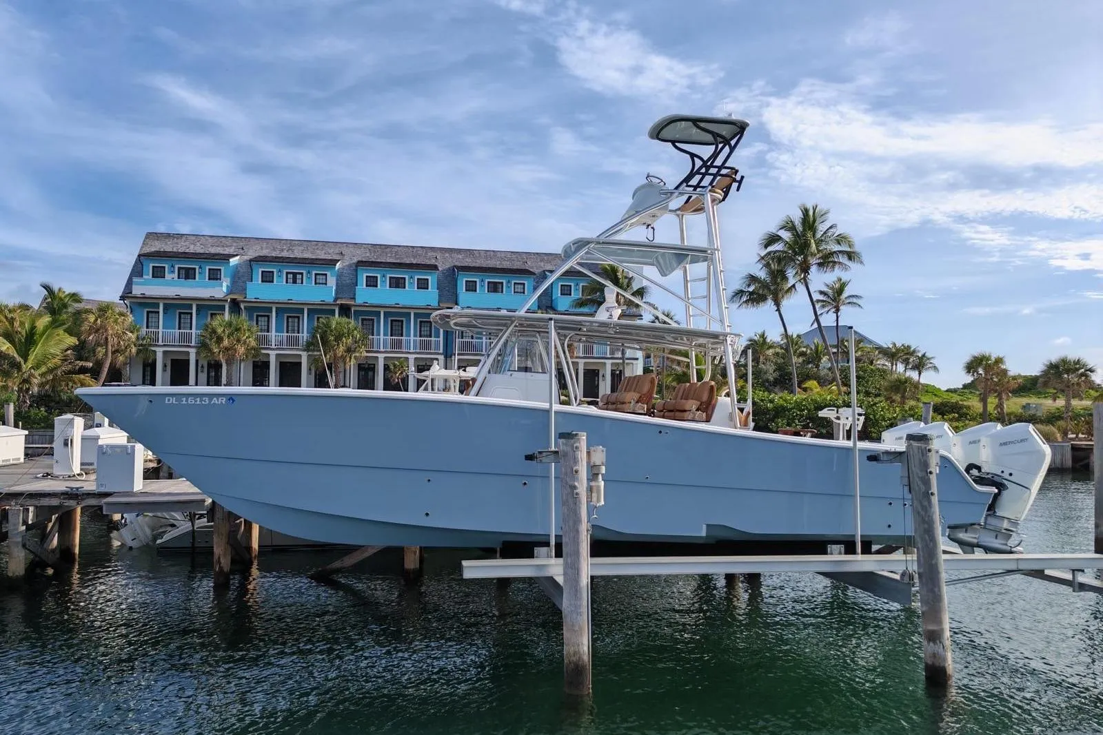 On deck, SHOX pedestals and full Deckit traction support long days on the run. Chiller plates in the drink boxes and starboard coffin box keep provisions and catches cold, the Coast 2 Coast windlass simplifies anchoring, and Zip Wake helps dial in attitude at speed. With an inverter, a head in the console, teak details throughout and just 40 hours on quad Mercury V10s, this 42 is turnkey and tournament-ready.