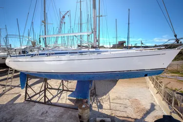 The Grand Soleil 43 (J&J, 2004–2005) is a fast Italian performance cruiser with a low wetted surface (reducing hydrodynamic drag), a powerful rig, a lead T-bulb keel to help reduce the center of gravity, and a deep rudder for excellent upwind/downwind handling.