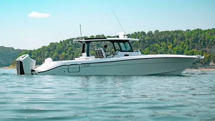 This 42 Lujo features the custom Moonstone Grey hull color, with matching paint on the motors and black accents throughout. The exterior smooth light grey upholstery is finished with the upgraded Bentley stitching. The cabin features Gray Aspen Wood, Feather Gray Upholstery, and Gray Onyx Countertops throughout.