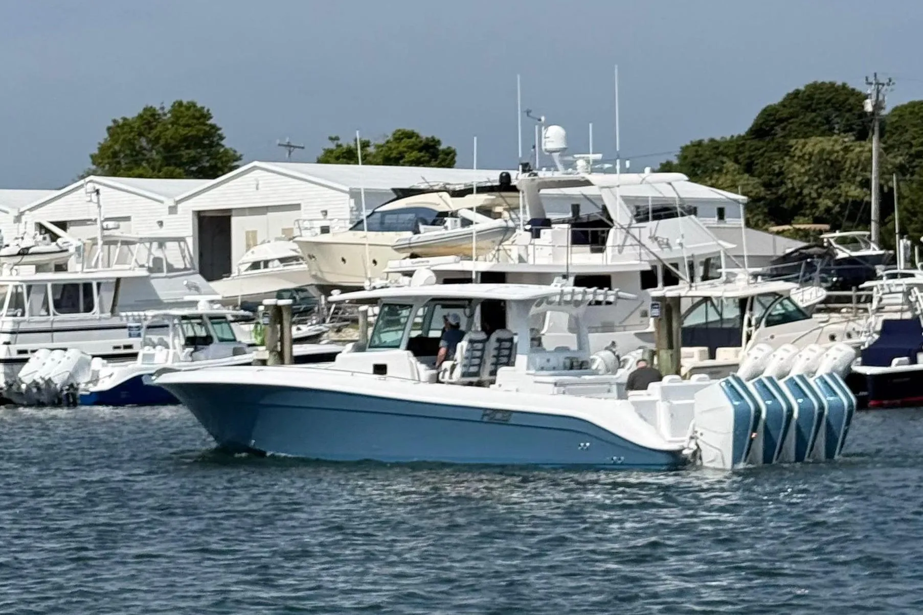 Bright steel blue hull. She's equipped with Quad Mercury V10 400HP Motors Painted White with Steel Blue Accents.