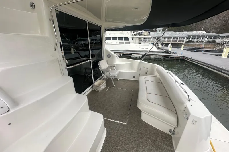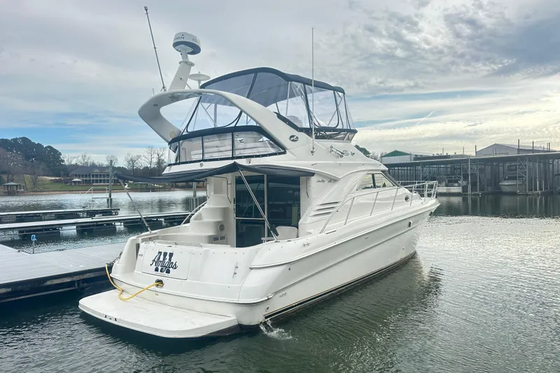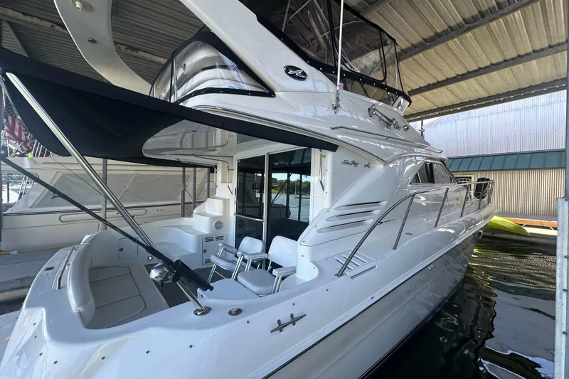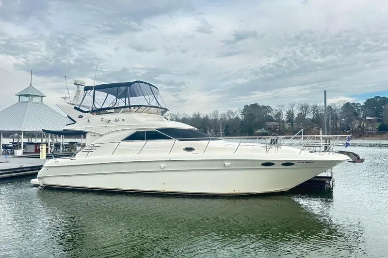 The Sea Ray 400 Sedan Bridge has individual options ranging from engine upgrades to a lower control station, and there's also a choice between two complete bridge plans and cabin layouts. The gracious standard cabin layout of the 400 Sedan Bridge has two large staterooms, two head areas, and a spacious midlevel galley with a salon-level breakfast bar. The forward stateroom has a full-size bed, cedar-lined hanging locker, floor storage, private head and shower, and a standard entertainment center with a TV - VCR - radio combination. The two twin beds in the port stateroom easily convert to a king-size bed. There's plenty of room for stowing personal articles in the hanging cedar-lined locker, built-in drawers, and floor storage. The guest head with shower is right next door. The magnificently finished galley has wood cabinetry, a flush-mounted three-burner electric stove, refrigerator with freezer, microwave, and coffee maker. The salon comes complete with an electric sleeper sofa, entertainment center with TV - VCR - radio combination, cocktail table, and a full dinette which can be replaced with an optional lower control station. An optional floor plan allows for a third stateroom to starboard with bunk beds, locker, and built-in storage drawers. Both plans feature deep-pile marine-grade carpet and two choices of granite-colored countertops and tables, with handcrafted wood trim throughout. Molded steps with a security hatch and gas-assisted latch provide safe access to the spectacular bridge, which offers a choice of two seating plans. The first allows for a starboard helm station with added room for electronics and custom slide and swivel helm seats. The second plan provides plenty of room for socializing with a portside helm station with dual companion seat plus spacious U-shaped bridge seating with a sunpad, filler cushions, and cocktail table. For good looks and easy maintenance, both designs include snap-in carpet liner, burl instrument panels, an aluminum framed venturi shield, fiberglass spoiler, Bimini top enclosure, new bridge aft enclosure, and a double sunpad aft of the seating area. The self-bailing fiberglass cockpit is equipped with a gas-assisted bilge service hatch, aft and side panel storage, fender storage tastefully concealed in the transom aft wall, even an ice maker. Here's another Sea Ray touch - the battery on - off switch is in the cockpit instead of the engine room. Regardless of the layout, the Sea Ray 400 Sedan Bridge boasts a wealth of standard equipment, windlass, interior Sunbrella carpet runners, even a Clarion AM-FM digital cassette stereo with six-disc CD changer, amplifier, subwoofer, eight speakers, and a bridge remote control. A standard accessory package comes complete with ACR remote-controlled spotlight, oil changer system for the diesel options, telephone inlet, and even a dual outlet vacuum system.
