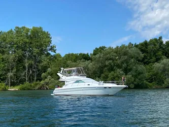 The Sea Ray 400 Sedan Bridge has individual options ranging from engine upgrades to a lower control station, and there's also a choice between two complete bridge plans and cabin layouts. The gracious standard cabin layout of the 400 Sedan Bridge has two large staterooms, two head areas, and a spacious midlevel galley with a salon-level breakfast bar. The forward stateroom has a full-size bed, cedar-lined hanging locker, floor storage, private head and shower, and a standard entertainment center with a TV - VCR - radio combination. The two twin beds in the port stateroom easily convert to a king-size bed. There's plenty of room for stowing personal articles in the hanging cedar-lined locker, built-in drawers, and floor storage. The guest head with shower is right next door. The magnificently finished galley has wood cabinetry, a flush-mounted three-burner electric stove, refrigerator with freezer, microwave, and coffee maker. The salon comes complete with an electric sleeper sofa, entertainment center with TV - VCR - radio combination, cocktail table, and a full dinette which can be replaced with an optional lower control station. An optional floor plan allows for a third stateroom to starboard with bunk beds, locker, and built-in storage drawers. Both plans feature deep-pile marine-grade carpet and two choices of granite-colored countertops and tables, with handcrafted wood trim throughout. Molded steps with a security hatch and gas-assisted latch provide safe access to the spectacular bridge, which offers a choice of two seating plans. The first allows for a starboard helm station with added room for electronics and custom slide and swivel helm seats. The second plan provides plenty of room for socializing with a portside helm station with dual companion seat plus spacious U-shaped bridge seating with a sunpad, filler cushions, and cocktail table. For good looks and easy maintenance, both designs include snap-in carpet liner, burl instrument panels, an aluminum framed venturi shield, fiberglass spoiler, Bimini top enclosure, new bridge aft enclosure, and a double sunpad aft of the seating area. The self-bailing fiberglass cockpit is equipped with a gas-assisted bilge service hatch, aft and side panel storage, fender storage tastefully concealed in the transom aft wall, even an ice maker. Here's another Sea Ray touch - the battery on - off switch is in the cockpit instead of the engine room. Regardless of the layout, the Sea Ray 400 Sedan Bridge boasts a wealth of standard equipment including twin 380 horsepower MerCruiser gas inboards, remote start generator, Raytheon electronics, Lofrans windlass, interior Sunbrella carpet runners, even a Clarion AM-FM digital cassette stereo with six-disc CD changer, amplifier, subwoofer, eight speakers, and a bridge remote control. A standard accessory package comes complete with ACR remote-controlled spotlight, oil changer system for the diesel options, telephone inlet, and even a dual outlet vacuum system.