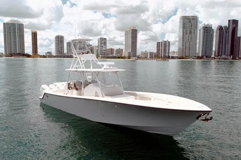 This 2026 SeaVee 420Z is a highly customized offshore platform built for serious tournament fishing, long-range cruising, and full offshore capability. Powered by quad Mercury 400 V10 Verados in Warm Fusion White with Grey Mohawk, this boat combines aggressive performance with premium rigging, a full Garmin electronics suite, Sailfish double-row tower, bow thruster, and upgraded sea chest bait system.