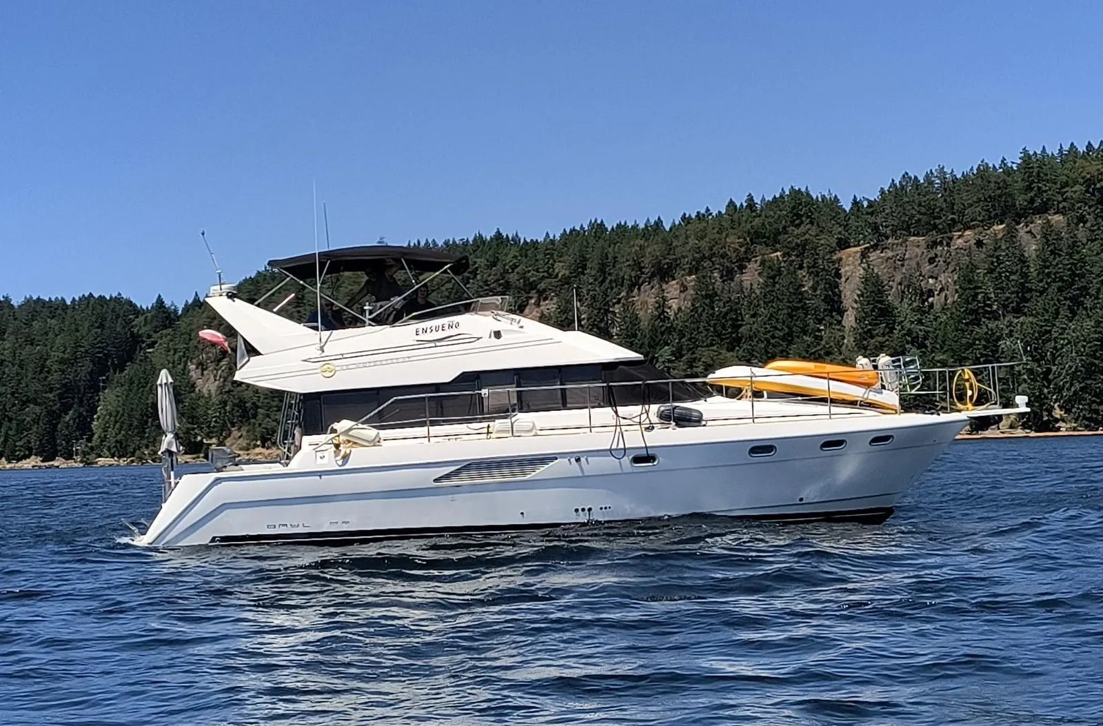 The 4388 Bayliner Motor Yacht is a great looking Command Bridge Sedan MY with a two stateroom layout that works well for family & friends. The Roomy Salon has a port side convertible dinette with seating for 6 to 8 people. To stbd, is the entertainment area with a Samsung TV, Fireplace and excellent storage. Further forward on the port side is the lower helm and directly across to port is the U-Shaped galley with Nova Kool side by side fridge freezer and Seaward 3 Burner Plus Oven LPG Stove. The Espar DL5 Diesel Forced Air Furnace will ensure cruising comfort during the shoulder seasons. The twin 250 HP Hino Diesels will deliver a respectable high cruise of 19 knots. The 8 Kw Onan Genset provides generous ship's power at anchor.