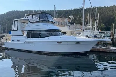 The interior is spacious, sleeps 8 with a great lay out. There is an abundant amount of storage space. With direct access to the aft stateroom from the cockpit through sliding glass doors it make it easy to provision the vessel. The large cockpit can be used to fish, dive or just relax. The command bridge with control console seats 6, with sliding pilot seat, map locker, fwd bridge lounge, companion and storage.
