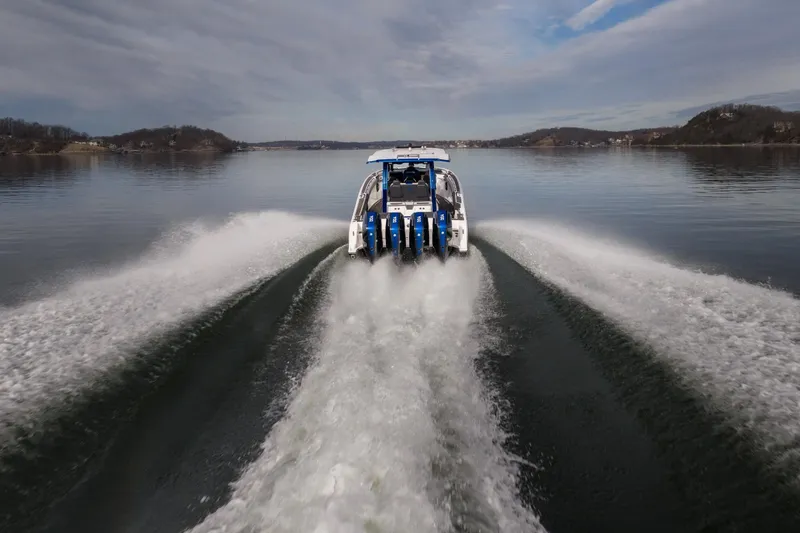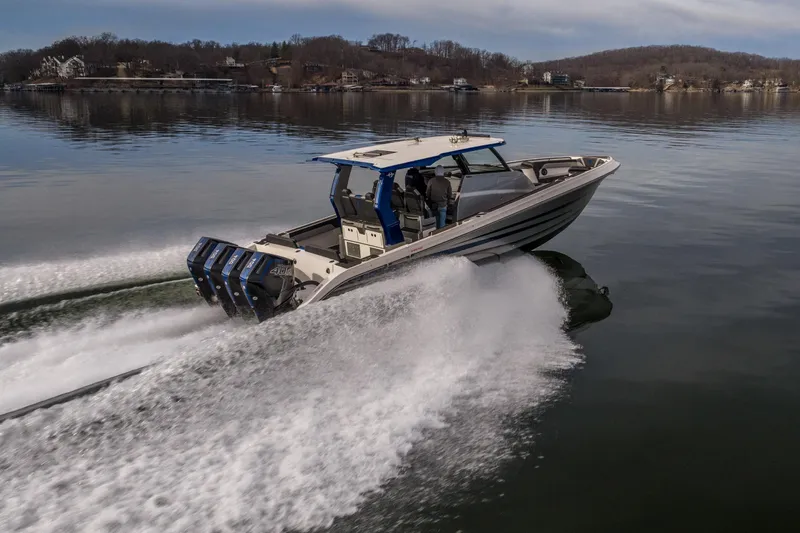 Powered by quad Mercury Verado 400R outboards with HD gearcases, this vessel offers exhilarating performance paired with advanced handling and precision control, making it equally suited for high-performance runs and luxury cruising at Lake of the Ozarks or beyond.