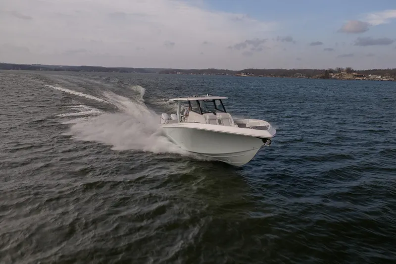 Below deck, the cabin provides comfortable overnight accommodations with air conditioning, a full berth, galley amenities, and an enclosed head, making the 43 SCX capable of extended trips as well as high-speed day runs.