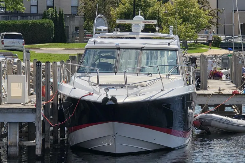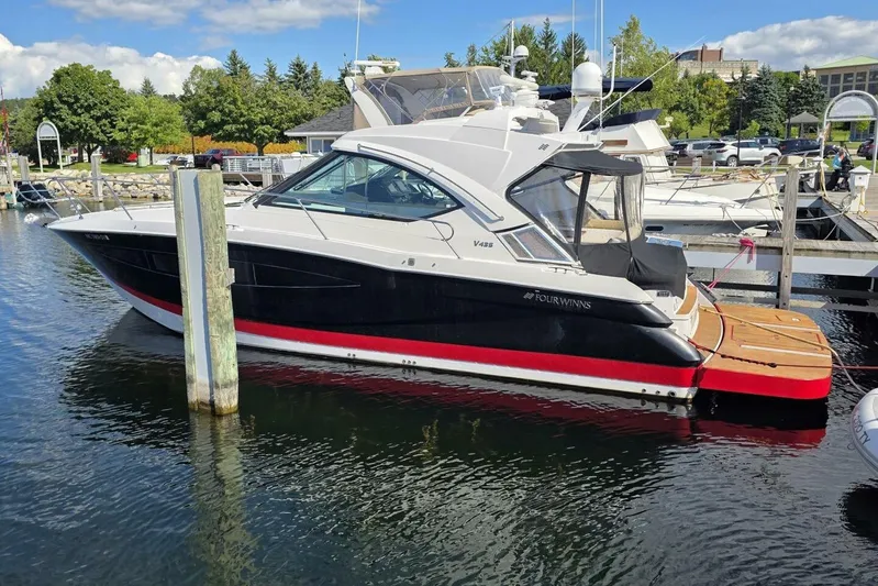 The 2009 Four Winns V435 is a luxury sport cruiser designed for both performance and comfort. The V435 cuts no corners and spares no expense, it simply offers a fantastic design with unmatched fit and finish as well as an abundance of creature comforts! The V435 features a fully equipped galley, large salon with panoramic windows, two heads and two private staterooms, making it perfect for entertaining or extended trips. With its sleek profile, spacious layout, and powerful twin diesel engines, it offers exceptional handling and a smooth ride. Additional highlights include a retractable hardtop, state-of-the-art navigation systems, and a generous swim platform, delivering a blend of elegance and functionality on the water. Ideal for boating enthusiasts seeking a premium cruising experience. This is a fresh water boat only, spending it's life on the Great Lakes. Upgraded Lumitec Underwater lights. Hydraulic swim platform with brackets for dinghy. Diesel generator. Retractable 50amp power cord. Teak on swim platform was professional redone with grit (for swimming) and in cockpit (oiled). Full suite of Raymarine E120, open array radar, and auto pilot. This boat is ready to cruise and is priced to move, so be sure to book your private showing today! FRESH WATER ONLY - VOLVO DIESEL IPS500 - HUGE SUNROOF - TEAK DECK - HARDWOOD FLOORS.