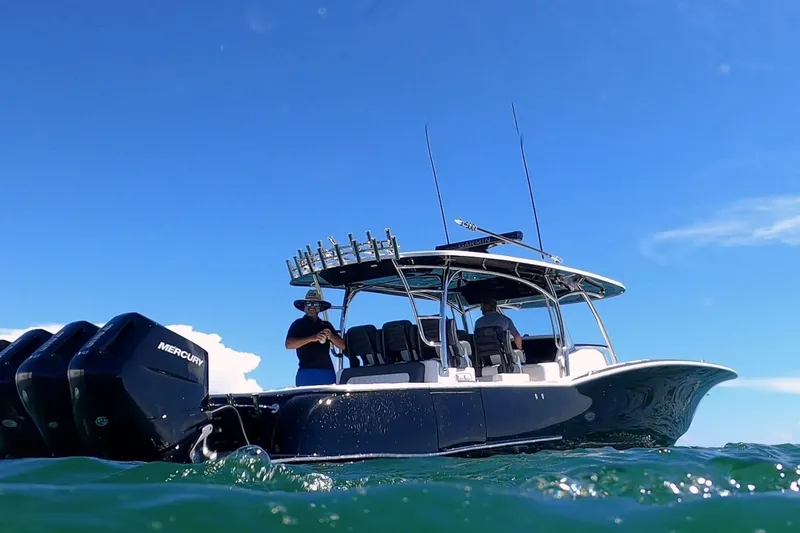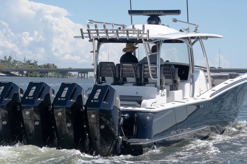 Introducing the 2027 Mag Bay 43CC from Cortez Cove Yacht Sales—a true statement of power, performance, and prestige. Powered by your choice of quad 425 V10 Mercury engines or triple 600 V12 Mercury engines, the 43CC delivers up to 1,800 horsepower with precision and authority.