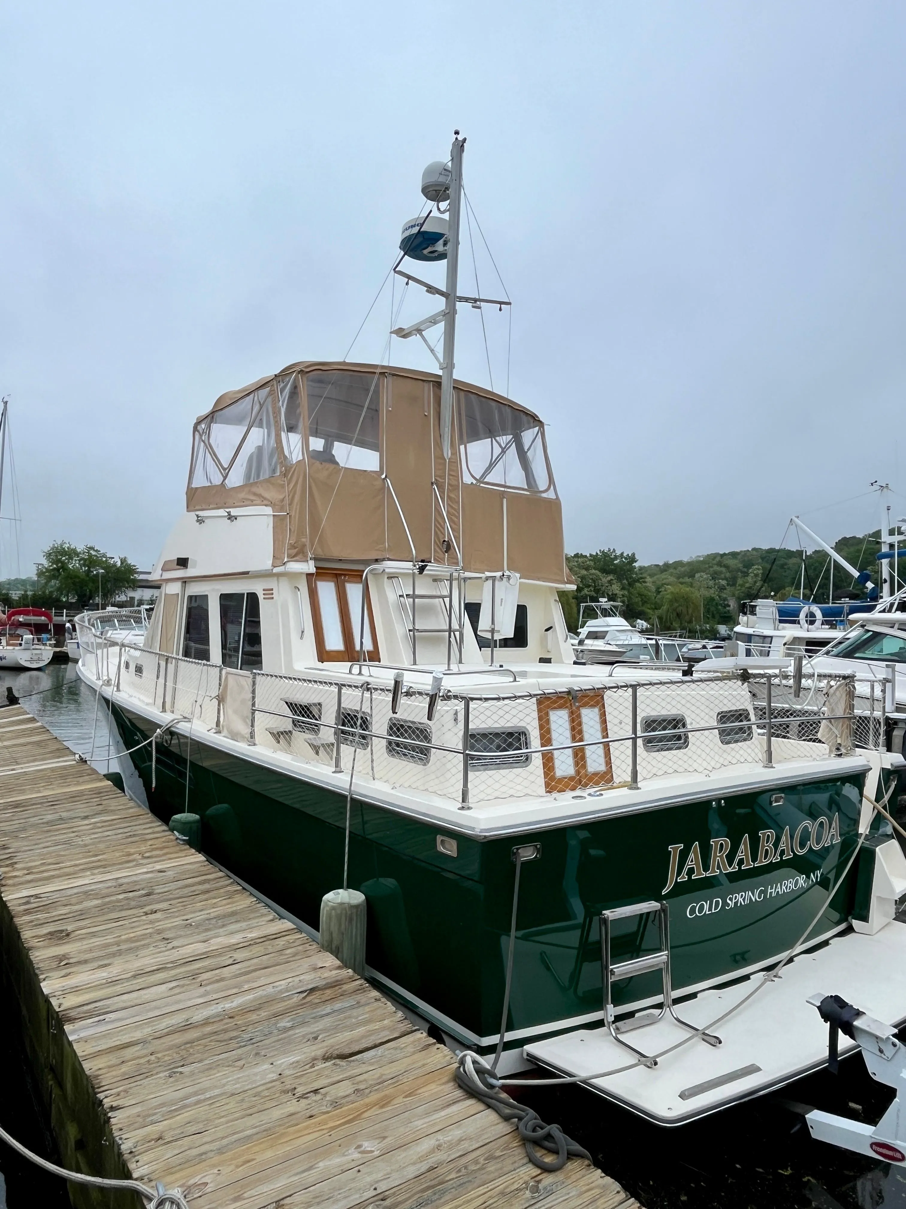 Don't miss out on this beautiful Sabre 43 Motoryacht, maintained and upgraded significantly over the years. The Sabre 43 Motoryacht differs from the norm in that she's constructed on a modified-V hull which allows her to run efficiently at much higher speeds than you would expect from a trawler-style design. Performance aside, the 43 is a quality-built, double cabin cruiser with full walkaround decks and well-arranged accommodations. The floorplan offers a spacious galley, large V-berth stateroom forward with a private head and a walk-in, tiled shower stall. The master stateroom offers a full-size walkaround queen berth, ample drawer storage, hanging lockers and much more. The master stateroom also offers a very large head with a tiled walk-in shower stall. Outside access is excellent: There are port & starboard deck doors entering the salon as well as a companionway door entering the aft-cabin top. Another door in the owner's stateroom provides direct access to the cockpit. The custom "Herreshoff" interior, with matched grain mahogany, is attractively finished with an abundance of fine craftsmanship from the proud folks at Sabre Yachts in Maine. Please contact listing broker Robbie LaGuardia to schedule a showing at Safe Harbor Glen Cove NY.