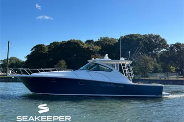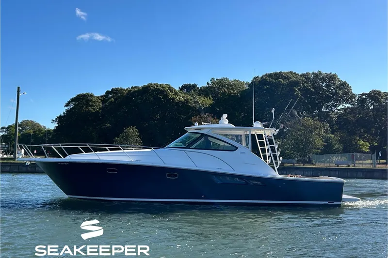 FEATURES: Lauderdale Blue painted hull, White w/ SS rubrail, Seakeeper SK6 gyro, Cummins Onan 11.5 kw diesel generator, (4) underwater lights(RGBW), Lenco electric 12V hydraulic recessed trim tabs, 24V bow thruster & trolling valves, 50 amp 65’ Glendinning power cord w/ adaptor for 30 amp service, 80 amp battery charger, 30” swim platform w/ built in ladder, molded in transom door & gate, LOWER COCKPIT-hot & cold cockpit shower, port aft additional raw water washdown, freshwater washdown, raw water washdown, 50 gallon transom baitwell, Teak battle saddle, port insulated flush floor storage box w/ Dometic ice making system & macerator, stbd insulated flush floor storage boxes w/ freezer plate & macerator, Dometic water maker, cockpit coaming bolsters, (6) gunnel mounted rod holders, cockpit LED courtesy lighting, port & stbd molded-in steps to deck walkways, HARDTOP- Tournament style w/ LED spreader lights & underside lighting, upgraded Gem Lux Blue water base w/ Gem Lux Carbon 18’ outriggers, Tiara Composite windshield frame w/ tempered safety glass & wiper system w/ two washers / wipers, UPPER COCKPIT- drop down engine room access hatch, port aft-facing mezzanine seat w/ cooler under seat & storage under step, stbd aft prep center w/ custom cutting board, grill & (2) drawer tackle locker, wet bar w/ sink w/ refrigerator door, rotating Stidd helm seat electrically actuated fore, aft & vertically, Mahogany steering wheel, 32,000 BTU air conditioning / heat, Ritchie Compass, port curved companion lounge w/ storage below & fwd facing swivel seat, Teak upper cockpit table, centerline entry to salon w/ acrylic locking door, SALON- (4) portlights, Teak companionway entry steps w/ hinged storage below, 12,000 BTU air conditioning / heat, solid Teak floor, U-shaped lounge / dinette seating to port w/ storage below & high-gloss teak table; converts to double lower berth w/ backrest converting to pullman, Dinette rod storage, 32” LED TV w/ HDMI port, soundbar w/ wireless subwoofer, BluRay player, central vacuum system, GALLEY-solid surface countertop, SS sink w/ solid surface cover & hot/cold faucet, under counter storage & aft galley pantry, two-burner electric cooktop w/ Corian cover, microwave/convection oven, Vitrigo dual refrigerator drawers & refrigerator/freezer drawer combination w/ ice maker, MASTER STATEROOM- bi-fold entry door, private entry to head, 10,000 BTU air conditioning / heat, manually actuated queen pedestal berth w/ rod storage below, cedar backed hanging locker, 24” LEDF TV, GUEST STATEROOM- entry from salon, upper & lower bunks, hanging locker w/ shelves, storage under lower berth, HEAD-full fiberglass head w/ glass shower door, stall shower w/ sump pump, drain & integrated seat, solid surface vanity countertop w/ sink & storage below, mirrored lighted medicine cabinet, Vacuflush toilet w/ macerator, FOREDECK- forward deck sun pad, fresh water at anchor locker, automatic all chain anchor windlass system w/ operation from foredeck foot pedal & remote switch at helm, molded-in fiberglass bow pulpit w/ SS roller, Delta 35 lb SS anchor