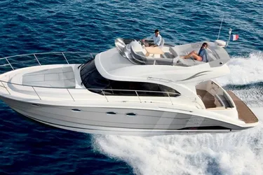 Elegantly designed 44 ft cruiser with 2 staterooms and 2 heads. The large salon with seating for 10, including the interior helm, can be converted into a dining area or an extra bed. With its well-designed kitchen that includes a convection oven, stove top and under counter fridge, in addition to the 9kw genset and dual AC systems, this vessel is perfect for day or weekend trips or even as a live aboard. Enjoy the breeze and views from the fly deck, which has an additional dining area and large sunbed as well as a fully equipped helm. Powered by twin Volvo Penta D-6 370 diesel engines (2200 hours) that allow for a nice 23 kts cruise speed, you can get anywhere around Guam in a snap. The vessel also has an ice maker, reverse osmosis machine, davit for a dinghy/wave runner and a sonic hull system to reduce hull growth.