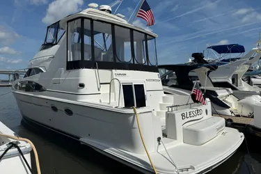 The Carver 444 blends classic styling with spacious comfort in a proven 44-foot cruiser. Featuring a bright, open salon with panoramic windows, two private staterooms, and two full heads, it’s perfectly suited for entertaining or extended cruising. With a well-equipped galley, generous storage, and dependable Volvo diesel performance, the 444 delivers the space and livability Carver is known for in a versatile, family-friendly yacht.