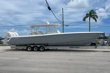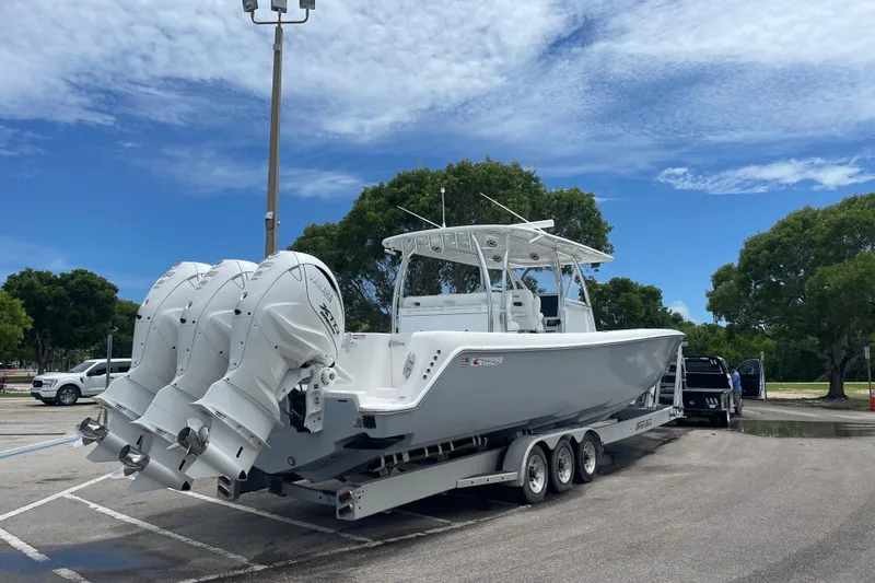 The newest 2025 44 ST Contender to hit the market. The triple 450 Yamaha’s allows this boat to reach a top end speed in the mid to low 60’s with a great fuel burn at cruise. Only 75 hours on the motors with extended warranties that have already been purchased. This boat is also equipped with a seakeeper 3. One of the very unique options on this boat is the “CB liner”. This liner is located in the console and creates a large storage compartment that is great for long range trips to stow away bags and gear. All 2025 model year boats come with an infused hull and digital switching which makes for a clean dash display. Barely used trailer will be included in this sale.