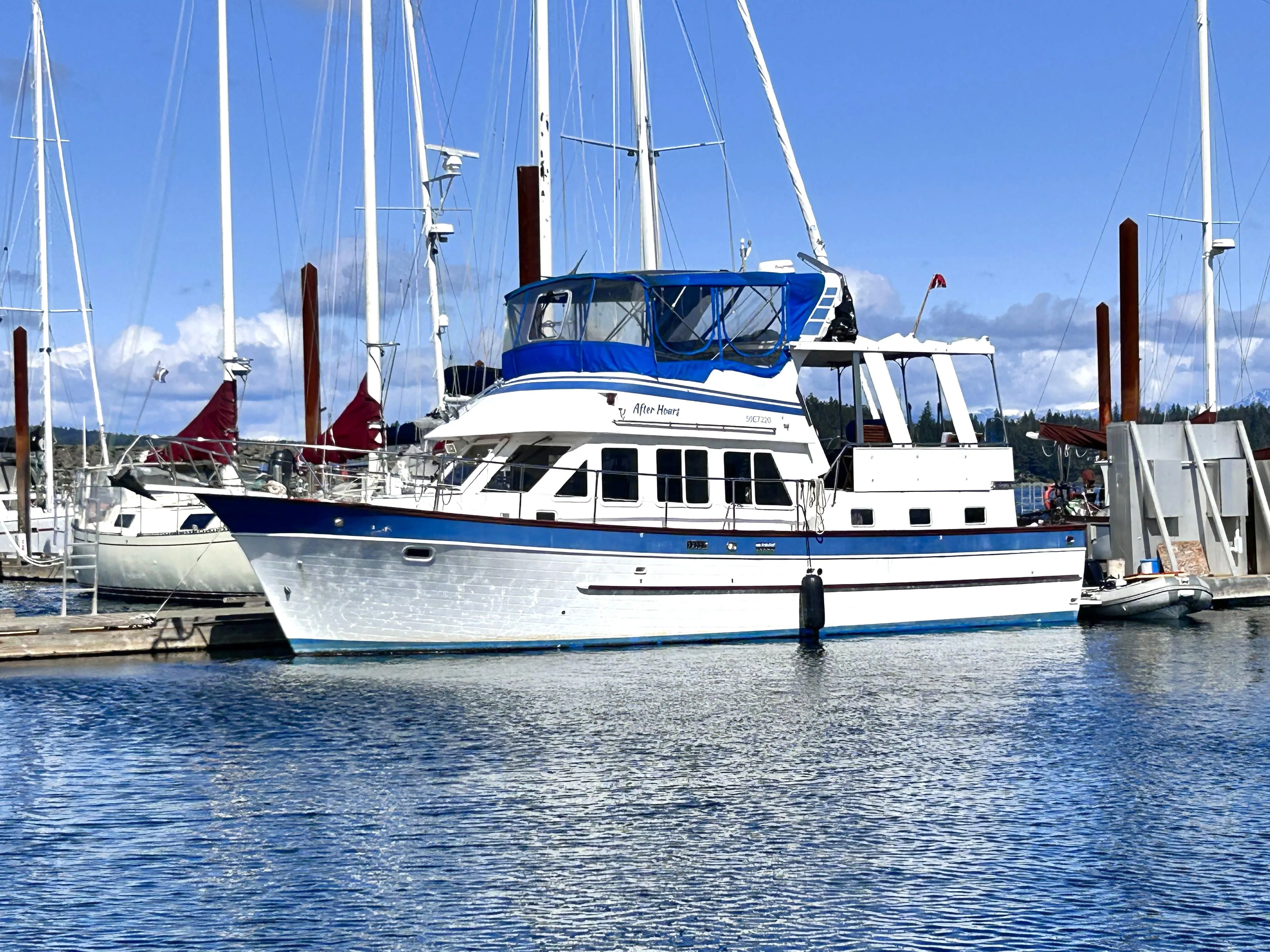 With twin Ford Lehmans totalling 270 hp, you’ll be able to see every island in the Gulf, Desolation, the Broughtons, or even Alaska! Cruise year-round with the hydronic heating. Stay out for ages with the 4 kw generator and 540 watts of solar, keeping the batteries topped up. If you like to fish, there’s a functional cockpit and a great tender.