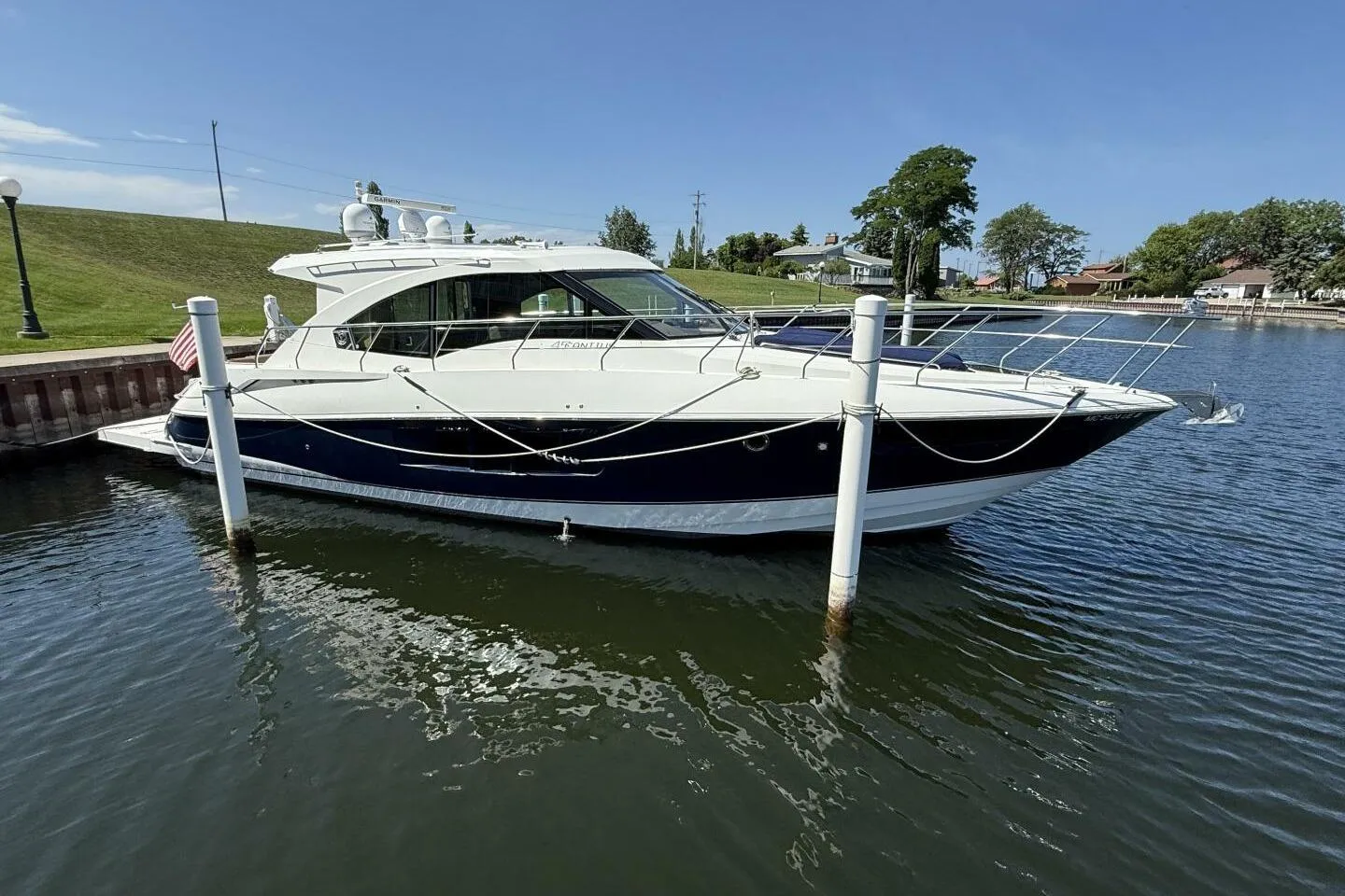 Welcome aboard this stunningly beautiful Cruisers 45 Cantius! This freshwater yacht has not only been well cared for, but is also very well appointed. The unique design of the Cantius line of yachts blends the desirable roominess of an aft cabin below deck along with the seating of a sedan bridge above deck creating a unique, expansive layout that is optimal for large groups and entertaining. With a 360 degree full glass exposure surrounding the salon, galley, and helm, exceptional visibility outward is achieved at every angle while allowing maximum natural light in. Coupled with a fully retractable power moonroof and sunshade, this unique combination contributes to a very open and ambient feel within this already generous space. This particular Cantius is also equipped with the optional Amtico flooring above deck, which is not only recognized for its durability, but also for its teak-like appearance and refined style. Storage is abound both inside and out including cedar-lined closets in both the owner and second staterooms. Flexibility and versatility are at your fingertips with a dual recliner in the salon, swivel flat screen LG TV that can be extended to be viewable from the outdoor aft lounge, as well as a dinette table that can swivel or be removed altogether. Want to take the festivities outside? The aft galley counter vertical glass window swings open from the bottom and attaches easily to the underside of the aft sunshade allowing your entertaining space to further extend to the aft outdoor lounge. This, coupled with the all-glass door locked in the open position, opens up the entire back of the yacht interior galley/salon to the aft lounge, creating an expansive entertaining space. Among the amenities in the outdoor lounge includes an electric Kenyon grill, a refrigerator, wet bar, as well as an ice maker. Want to lounge in the sun? The aft seating area can easily converted to a sun lounge/pad with a simple press of the button. Too much sun? Another press of a button and you can extend the overhead shade panel over the entire aft lounge/seating area. Looking to cool off? Step out on the hydraulically controlled swim platform, and with just a touch of the button, the platform can be easily lowered into the water. Want to swim in the evenings? This Cantius is also comes equipped with the optional underwater lighting system at the stern.