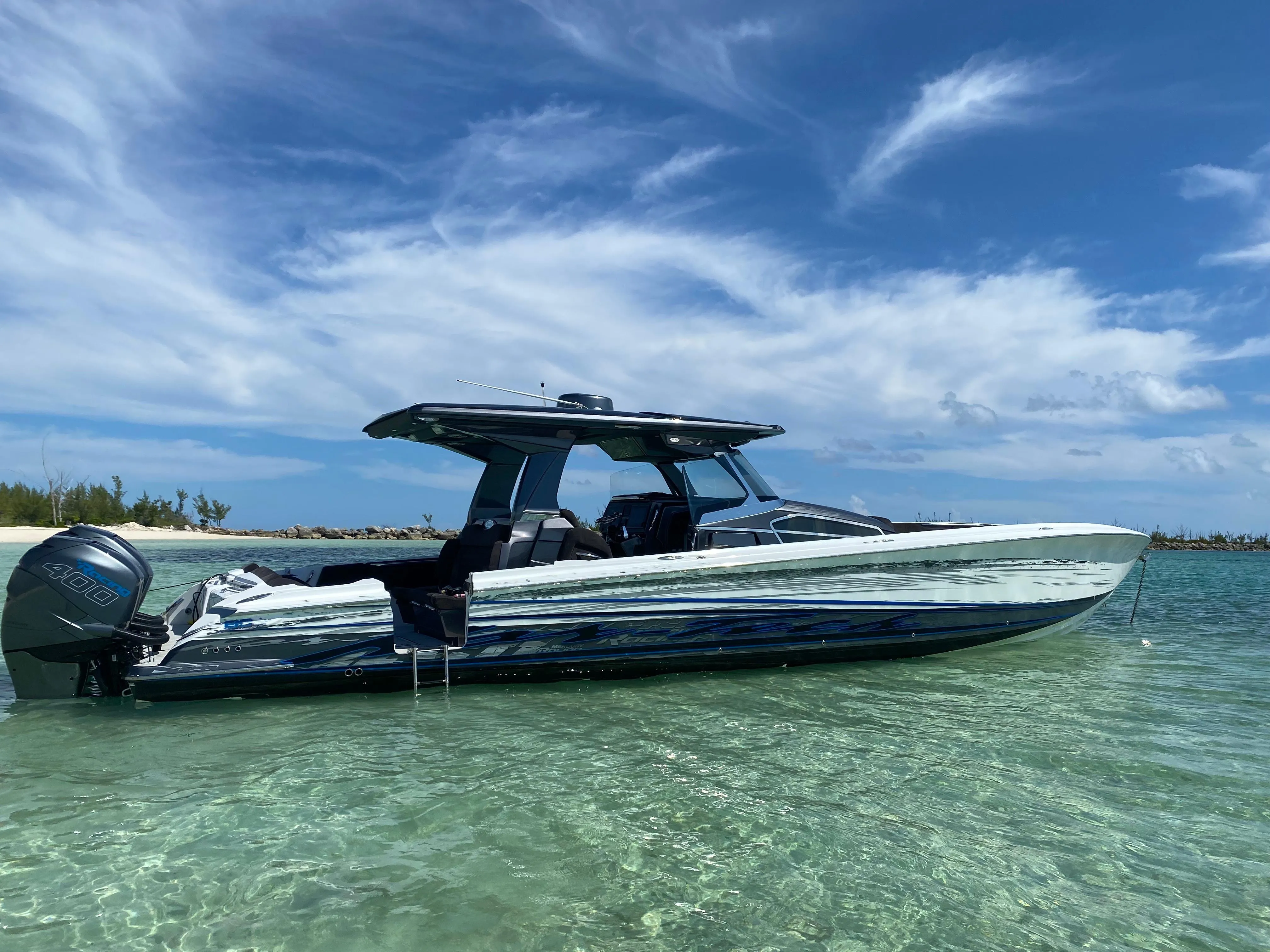 Expanse Lounge seating in the bow and stern , huge deck spaces, upgraded materials in excellent condition. Full wet bar, in deck stowage, high end sound system entertainment center , cold-plate cooler to insulated fish boxes. Amenities, including a full shower, enclosed head, cabin and helm air conditioner, berth, alcantara upholstery and custom design hull paint.