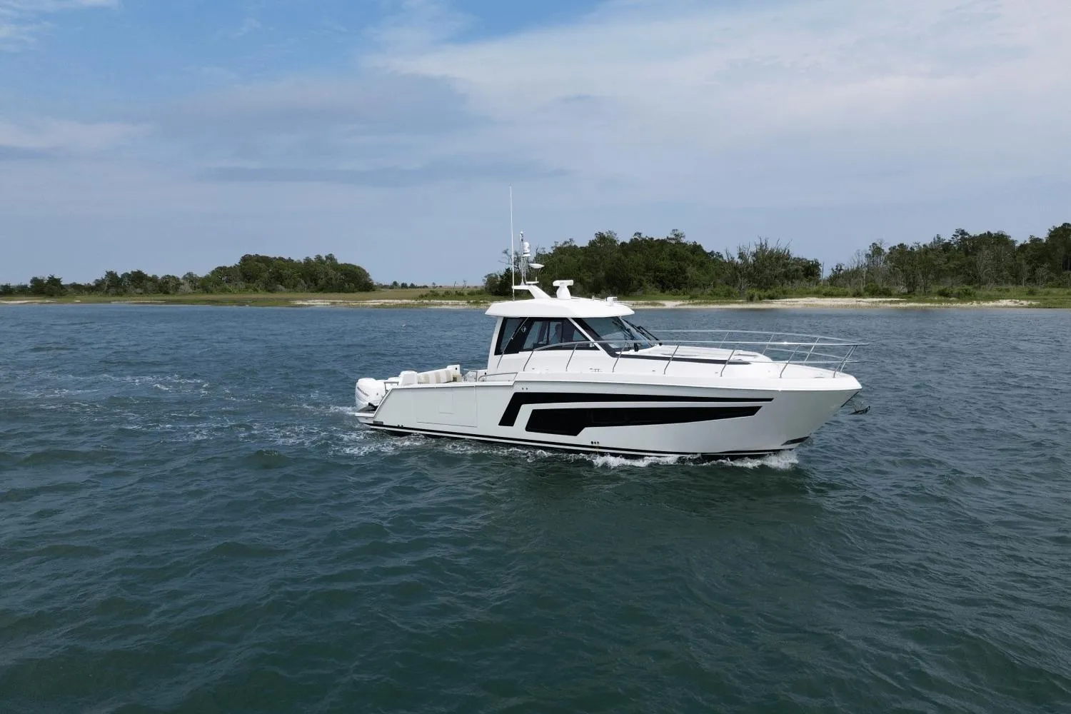Ocean Alexander broke new ground with the 45 Divergence Coupe, blending the brand’s legacy of luxury and innovation with the versatility and performance of an outboard-powered sport yacht. This 2021 model, powered by quad Mercury 400 Verados with joystick control, delivers the speed, comfort, and capability to handle everything from island-hopping and day cruising to overnight escapes in style. With its sleek profile and aggressively modern lines, this 45 Coupe stands out at every dock. But it's what lies beneath the surface that truly impresses—meticulous craftsmanship, high-end materials, and engineering that rivals much larger yachts.