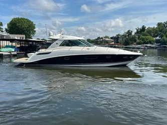 Currently in Freshwater, 2010 Sea Ray 450 Sundancer, 380 HP Cummins with 962/965 hours, Cummins Onan Marine Generator with 2529 hours. Bottom paint was done this year, 2022. Engines & Pods Just Serviced, Stereo upgrade including fusion head units, speakers on the roof, etc., Cockpit AC, Hardwood floors in Cabin, wooden tables in cabin and cockpit. Newer SeaDek flooring on the swim platform and cockpit. The rear aft canvas is black. It is equipped with the Cummins 380 HO Engines coupled with DTS Transmission, Zeus Pods & Raymarine electronics, including radar, FLIR night vision, and a New Cabin refrigerator.