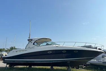 Yet another Sea Ray sales success story, the 420 Sundancer set the gold standard for express yacht styling and luxury during her production years. Her bold styling compared well with the best Mediterranean sport cruisers of her era, and a large cockpit and spacious interior made many of her European counterparts seem small in comparison. Built on a deep-V hull with prop pockets to level the engines, the luxurious two-stateroom, two-head floorplan of the 420 Sundancer is an impressive blend of high-gloss cherry joinery, Ultraleather seating, and designer fabrics. Privacy doors separate both staterooms from the salon, and the Sundancer’s full-service galley includes an undercounter refrigerator/freezer in addition to Corian counters and hardwood flooring. Topside, the entire cockpit sole can be raised at the push of a button for engine access. An extended swim platform, split forward head compartments, transom storage locker, and underwater exhaust system were standard.