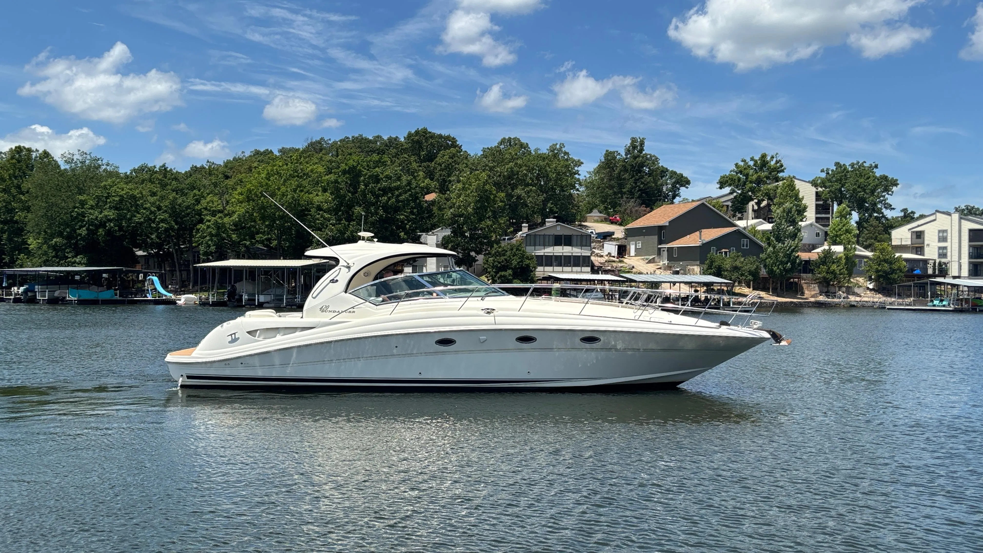 Very nice, always freshwater, two-owner boat with current owner having owned since 2005. It's a well maintained Sea Ray 420 Sundancer that has provided numerous fun filled boating experiences for the family for years. This boat features a hardtop, Seadek flooring throughout the cockpit and swim platform, Kohler Gas Generator (1,440 hours), AC/Heat, Isinglass Canvas Enclosure, Windlass Anchor System, Remote Spotlight, Bow Cushion and Clarion Stereo System with upgraded Speakers.