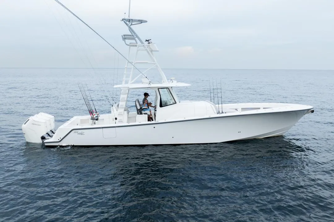 With Trip 600 Mercs all White w/Platinum Merc Warranty thru 8/01/2028 Platinum, 230 hrs, Mercury Joystick w/Vessel View 703, Auto Engine Flush High Performance Trim Tabs w/Indicator, Custom Fiberglass Top w/Gap Tournament Tower w/Full Controls + Garmin 8612 & Gemlux Outrigger Bluewater Bases & 22' Carbon Fiber Poles Custom Custom Color Whisper Gray, Rigid 40" Light, Triple Bolster Helm Seats w/2nd Row Bench Seating & Elec Slide Out Cooler, EZ Puller Windlass w/upgrade to 600ft of Spectra Line, Bow Thruster + Tower Control, 2-Side/Dive Doors, Edson Black Wheel Helm & Tower, 9KW 75amp Diesel Genset Helm & Cabin A/C Units 16k BTU each, Seakeeper 6AC Gyro, 50amp Shorepower Service, 5-Livewells 4-Aft, 2-Aquarium Windows + 1-Frw Floor Well + 1-Above Deck Well Hookup Powdered by Two 3-Pump Seachests + 3-Painted Light Blue, Finished Awlgrip Bilge, Rear Bench Seat, Air Horn, 12-Console Rod Holders, 36-Gunnel Rod Holders + 2-Swivel + 2-Combo Holders + 6-Deck ring Gunnel Drink Holders, 5-Elec Reel Outlets, Under Gunnel Lighting W,R,B & Mauve, 4-Underwater Lights RGBW, Compartment Lights, Refrigeration Cooling Plates for Large Forward Fishbox, Satin Finish Helm Electronics Area 2-22" Garmin Units + 1-16" ,Grid Remote, 1224 x HD2-12KW Open Ray Radar, CM599LH-W KW Transducer Glassed in Keel, Auto Pilot, GXM54 Sat Ant, 2-Icom M400BB VHF, Marine Guardian 1.0 Alarm System & Tracker, Fusion MS-RA770 Stereo, JL Audio Speakers & Amps, Speakers: 2-6.5" + 6-7.7" + 6-8.8" + 2-10" Subs + 2-12" Subs Driven by 3-Amps = 2,600 Watts of Power, Black Oak Night Vision Camera, Also Included BlueWater Com Rocket Launcher w/Offset Base, This Boat is Loaded w/Custom Items Call Hunter for Full Build Sheet, New Boat on Order-Turn Key Ready to Go, Canvas Covers for Console, Front Row Seats + 2nd Row, 2nd Station 1-Console + 1- Seat + Front Lounge Seat