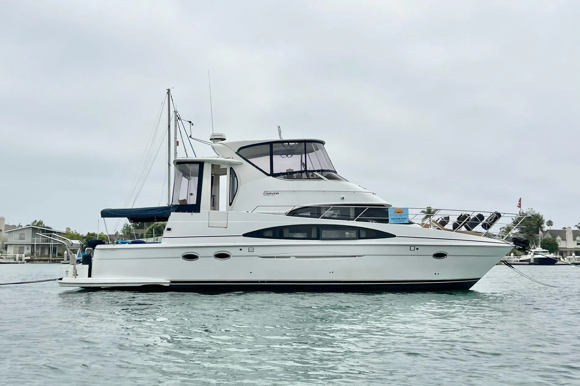 The Carver 444 Cockpit Motor Yacht combines the superb luxury and spaciousness of an aft cabin with exceptional contemporary styling and thoughtful design. Carver's signature raised walkdeck design also allows for a wider, much roomier cabin than other yachts this size. Combined with the way Carver united the salon and galley into one spacious and elegant "great room", this adds up to outstanding cruising comfort. The expansive great room features all sorts of amenities, from the sumptuous designer decor and UltraLeather sofa, to the beautiful yet practical solid-surface countertops. When it comes to sleeping accommodations, owners will welcome the unexpected luxury of two private staterooms, each with its own private head compartment. On the bridge, passengers can relax with the L-shaped lounge that seats five and the wetbar that provides convenient bottle storage. The elegant aft deck offers a hardtop that covers the entire deck, plus an electronics arch, and the convenience of an integral bridge stairway and wing doors. For even more fun, the large cockpit offers plenty of space to play.