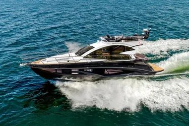 Cobrey’s 45 Fly pairs precision engineering with luxury finishes. Twin D6 drives launch you to hull speed, 35 kn, while joystick and trim tabs hold your line through chop. The hydraulic platform and gangway let you step right onto the water. At the helm, dual 12″ chartplotters, autopilot, and radar keep you focused on the horizon.