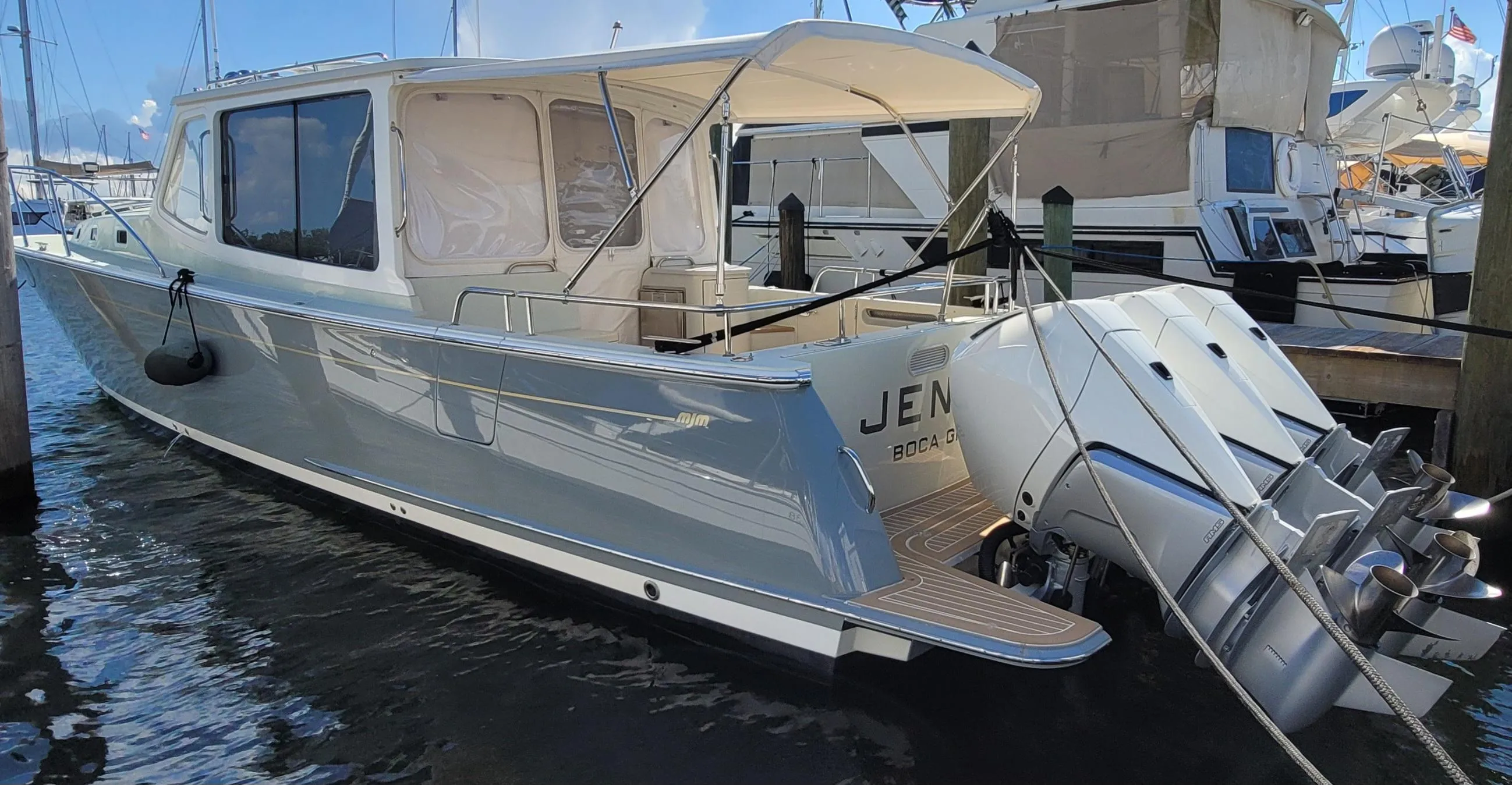 This 2020 MJM 43z is in Mint condition with just 145 hours on the triple Mercury Verado 300hp outboards! Well equipped and beautifully designed with custom touches throughout. The best option for a near new outboard powered MJM 43z.