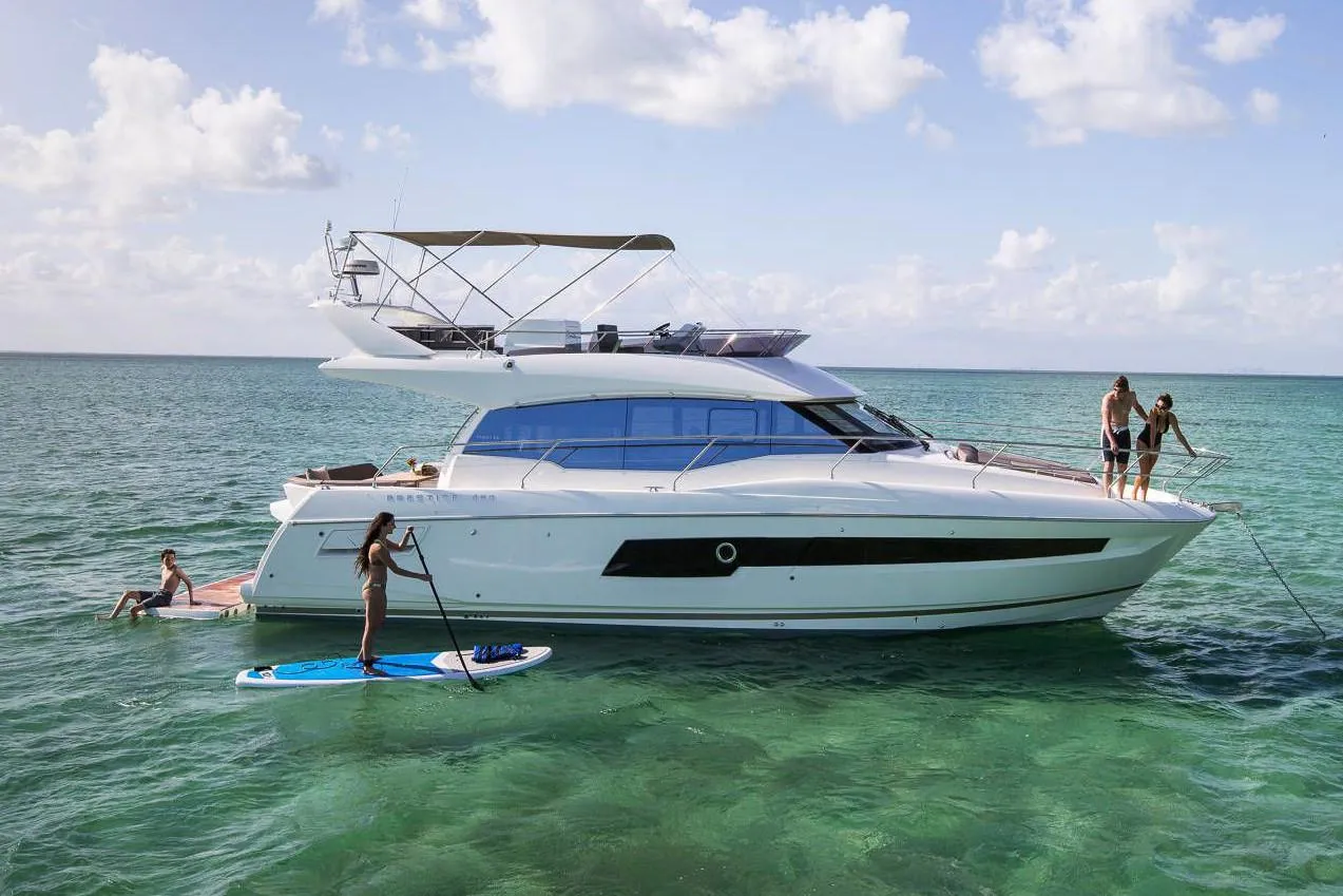 On the exterior, she features the signature style of the latest PRESTIGE Yachts, with an expanded, continuous line of windows in the hull. This Flybridge integrates the concept of the L-shaped cockpit, which allows for maximum use of space. Transformable into a very large aft sundeck, this cockpit can also house a fully equipped skipper cabin.